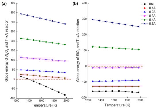 Thermodynamic analysis of Ti-xAl alloys showing (a) the Gibbs free-energy change for the reaction with Al2O3, and (b) that for the reaction with SiO2. The figure was redrawn and reprocessed by the authors based on the data and thermodynamic relationships reported in Refs. [19,20].