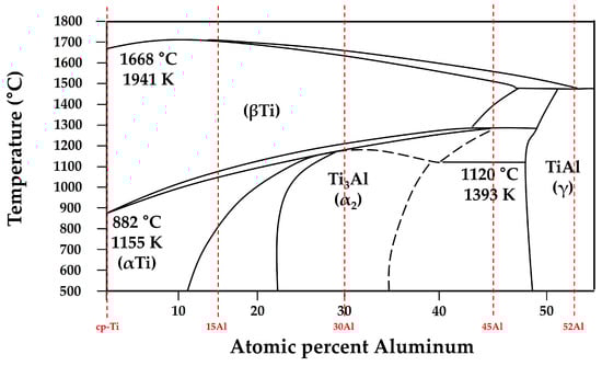 Ti-Al binary phase diagram redrawn and adapted from Okamoto et al. [24], with the alloy compositions examined in this study indicated by vertical dashed lines. The corresponding T0 and TL values used in Table 2 were obtained from this diagram.