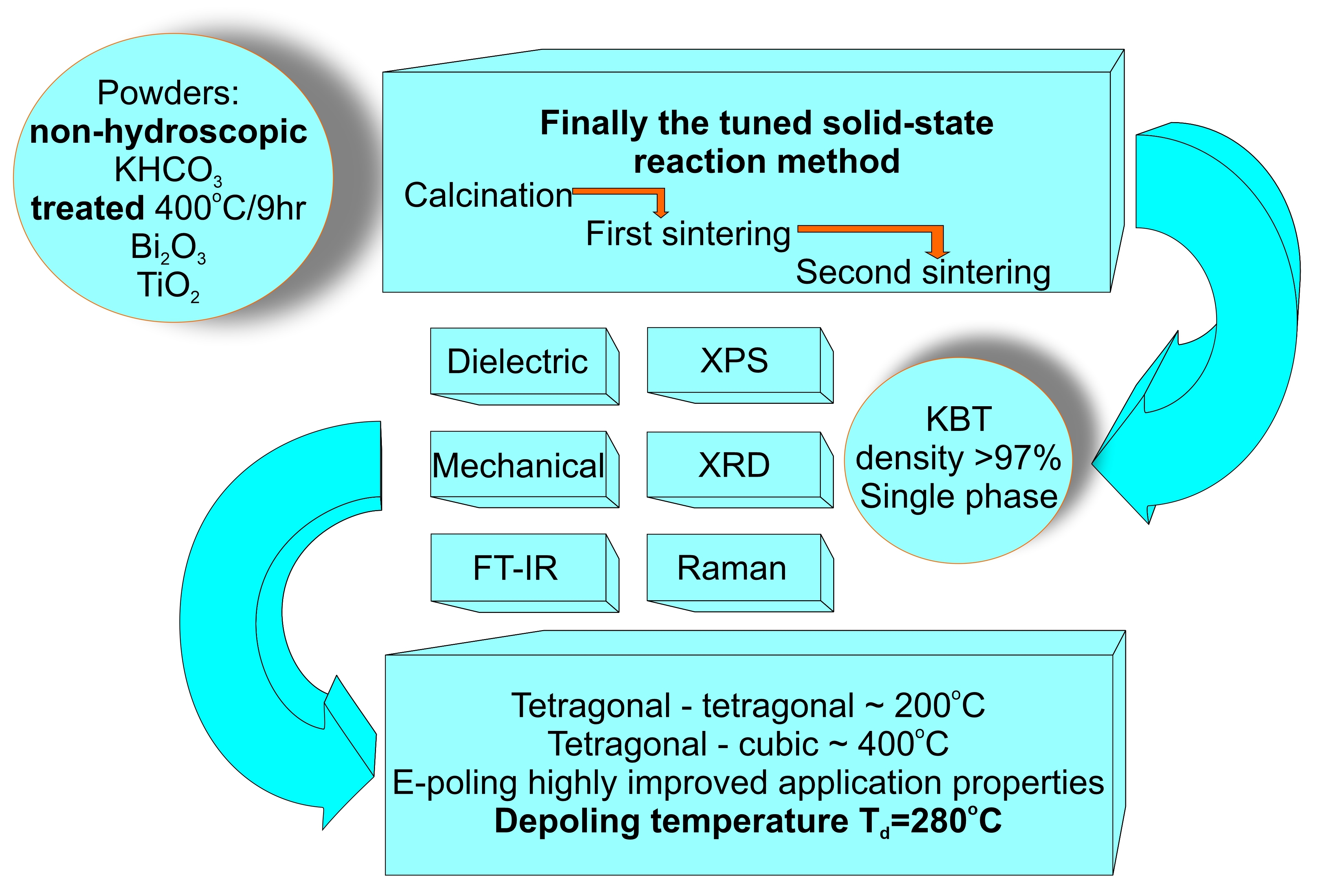 34]. X-ray, DSC, mechanical, and dielectric responses relate to macroscopic structural changes, whereas the Raman technique provides information about microscopic (local scale) structural changes. Apart from the different local stress fields within individual grains, there are at least two reasons for the existence of stress in KBT: (1) the difference in the ionic radius of ions occupying the A-site and (2) the existence of chemically ordered nanoregions and polar regions across a wide temperature range. These stresses can lower the temperature at which the tetragonal-cubic phase transition occurs in Raman studies. Some differences in the phase transition temperatures compared to previous studies may be due to variations in technological conditions used by different authors.