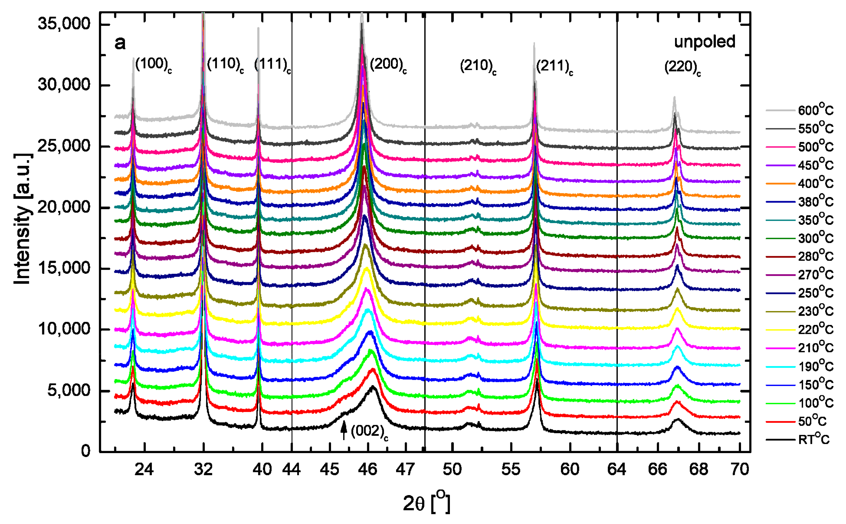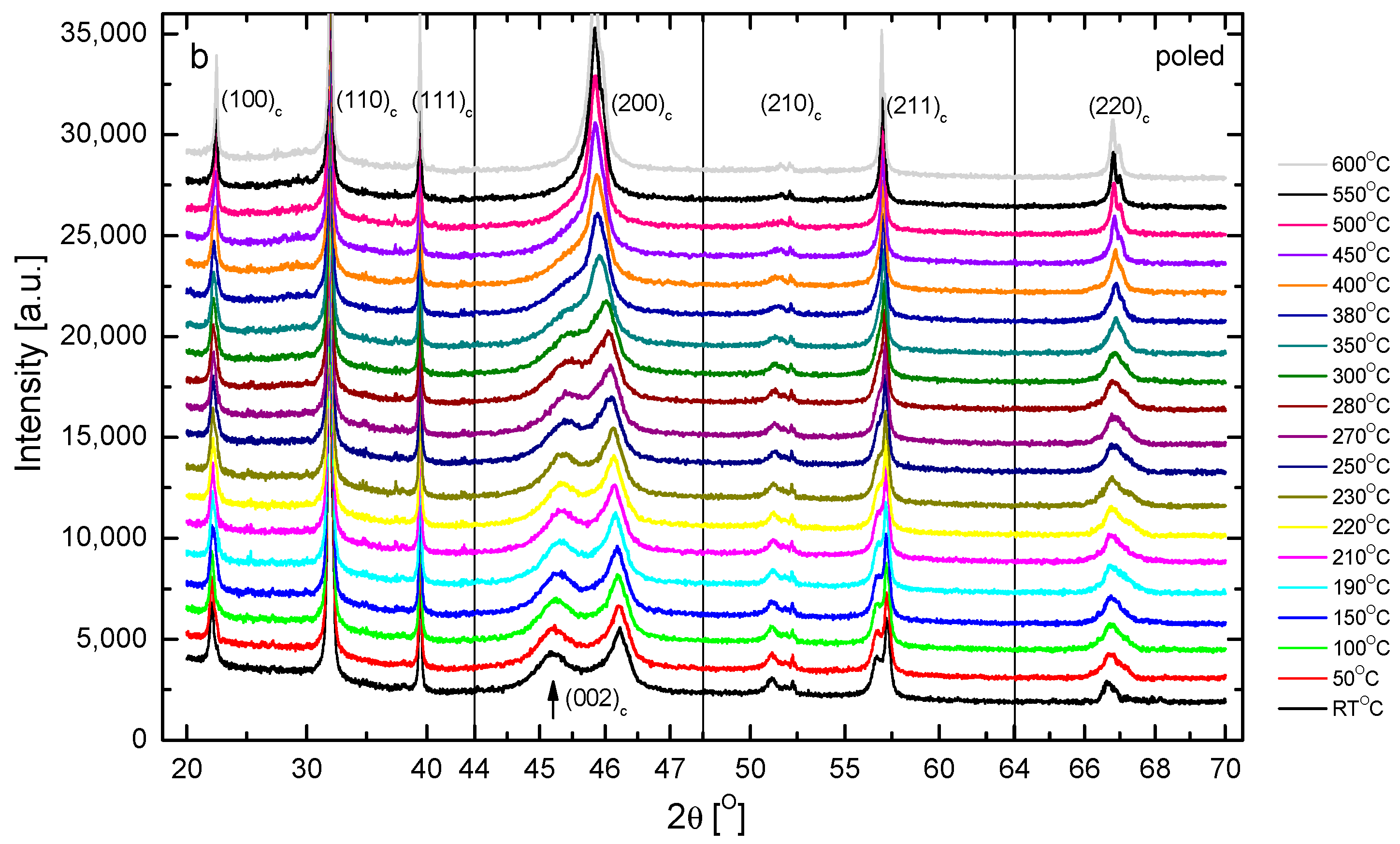 c peaks has an equal 1:2 characteristic for the tetragonal phase) in comparison to the unpoled one, and the splitting disappears at a temperature of approximately 450 °C instead of 400 °C for the unpoled one. An increase in intensity of the (002)