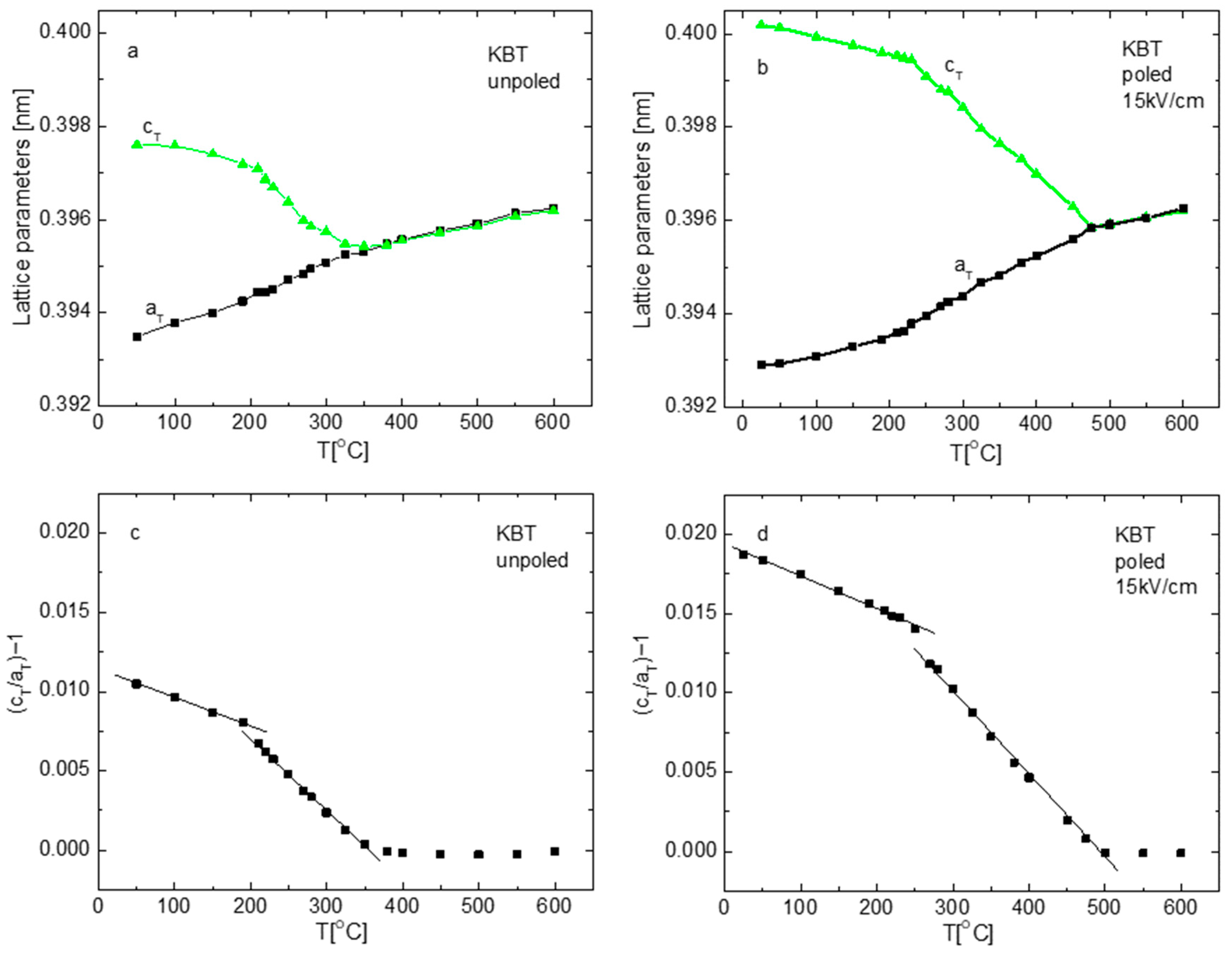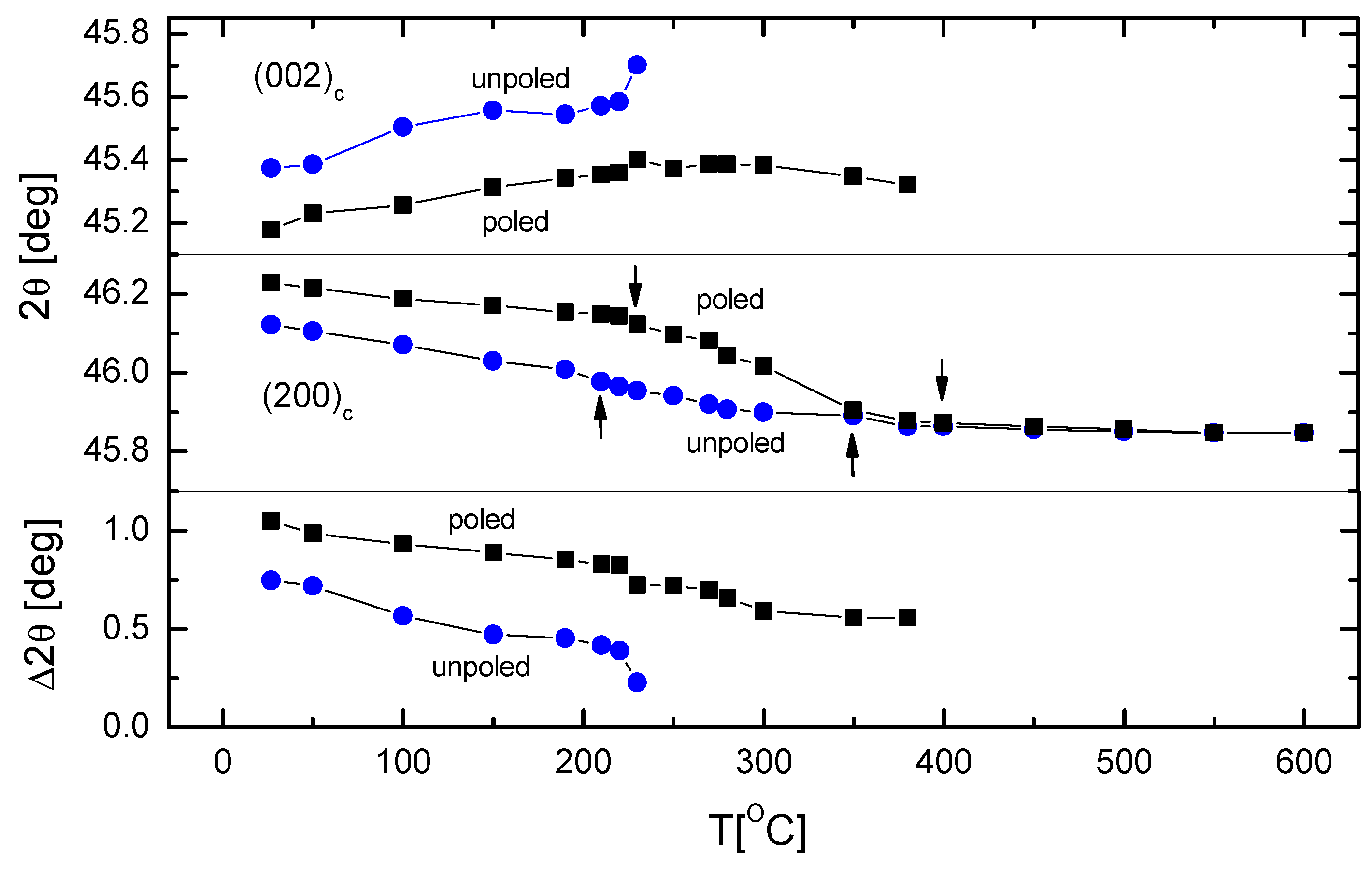 c peak also undergoes a slope change at ~200° and at ~380–400 °C for the unpoled state (three different straight lines can be fitted to the points). The lower-angle shift of the Bragg peaks indicates a gradual increase in unit cell volume with increasing temperature; however, the slope changes of 2Θ-T curves indicate structural transformations. The symmetry changes which occurred in KBT are from the room-temperature tetragonal phase to a high-temperature cubic phase, and additionally, between tetragonal phases at about 200 °C. Considering the phase transitions sequence, the slope changes of 2Θ-T curves can be attributed to the tetragonal-tetragonal and tetragonal-cubic phase transitions. For the poled sample, the slope changes of 2Θ vs. temperature curves are shifted towards higher temperature, which further show that the electric field transforms the cubic phase into a tetragonal (ferroelectric) one and extends the temperature range in which the tetragonal phase exists. In addition, in both unpoled and poled samples, a shift in the position of the (002)