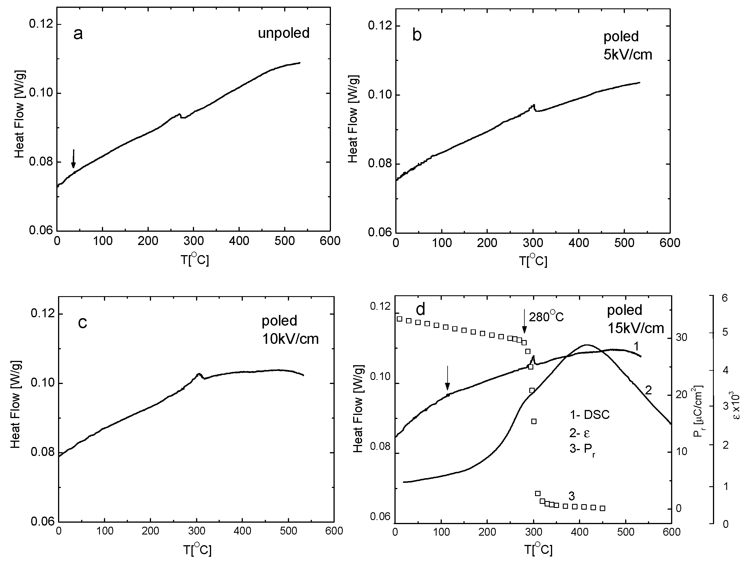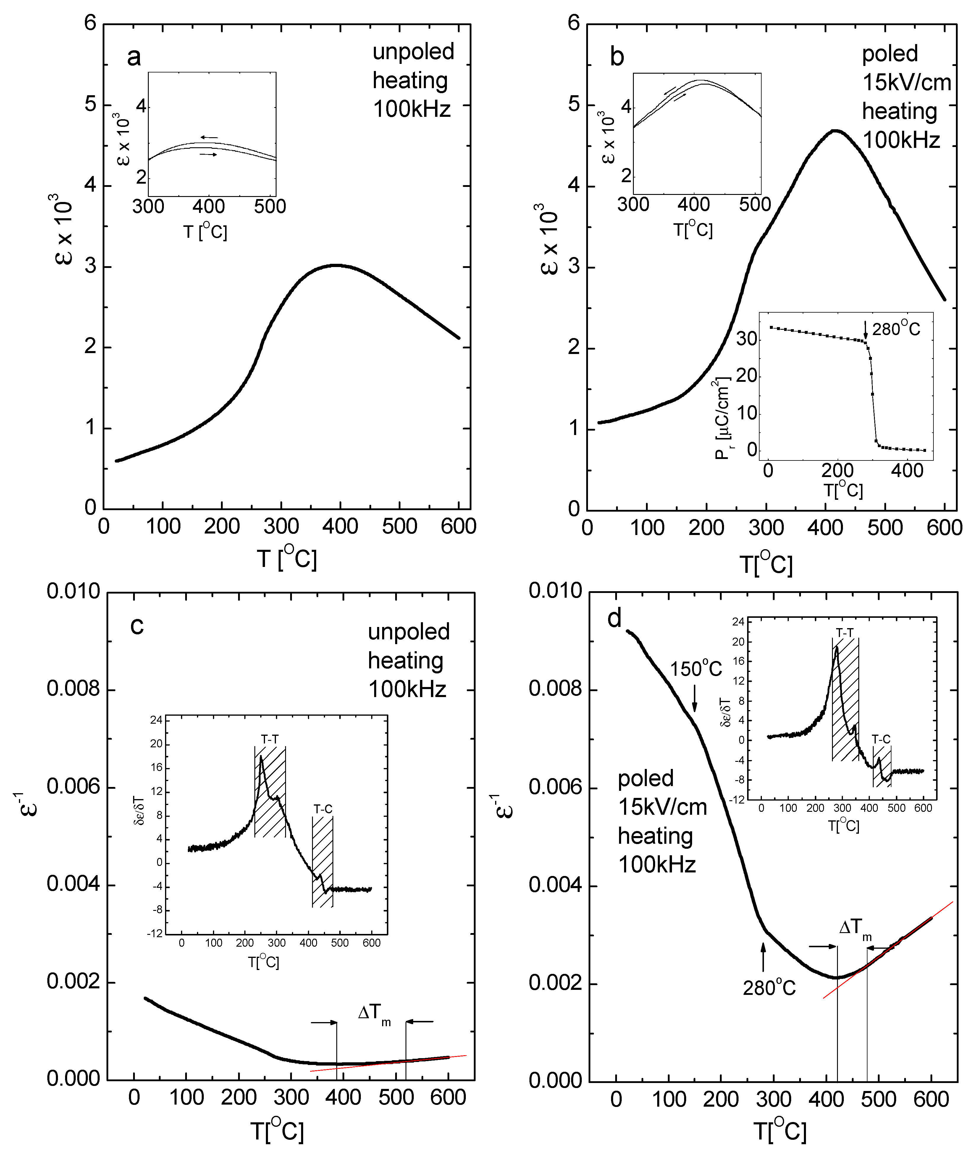 Figure 5a,b. The ε(T) curves for the unpoled and poled states differ. In the unpoled state, after a rather slow increase in ε up to about 215 °C, there is a faster increase up to about 270 °C, and then it enters a “diffuse region”, where it increases slowly up to T