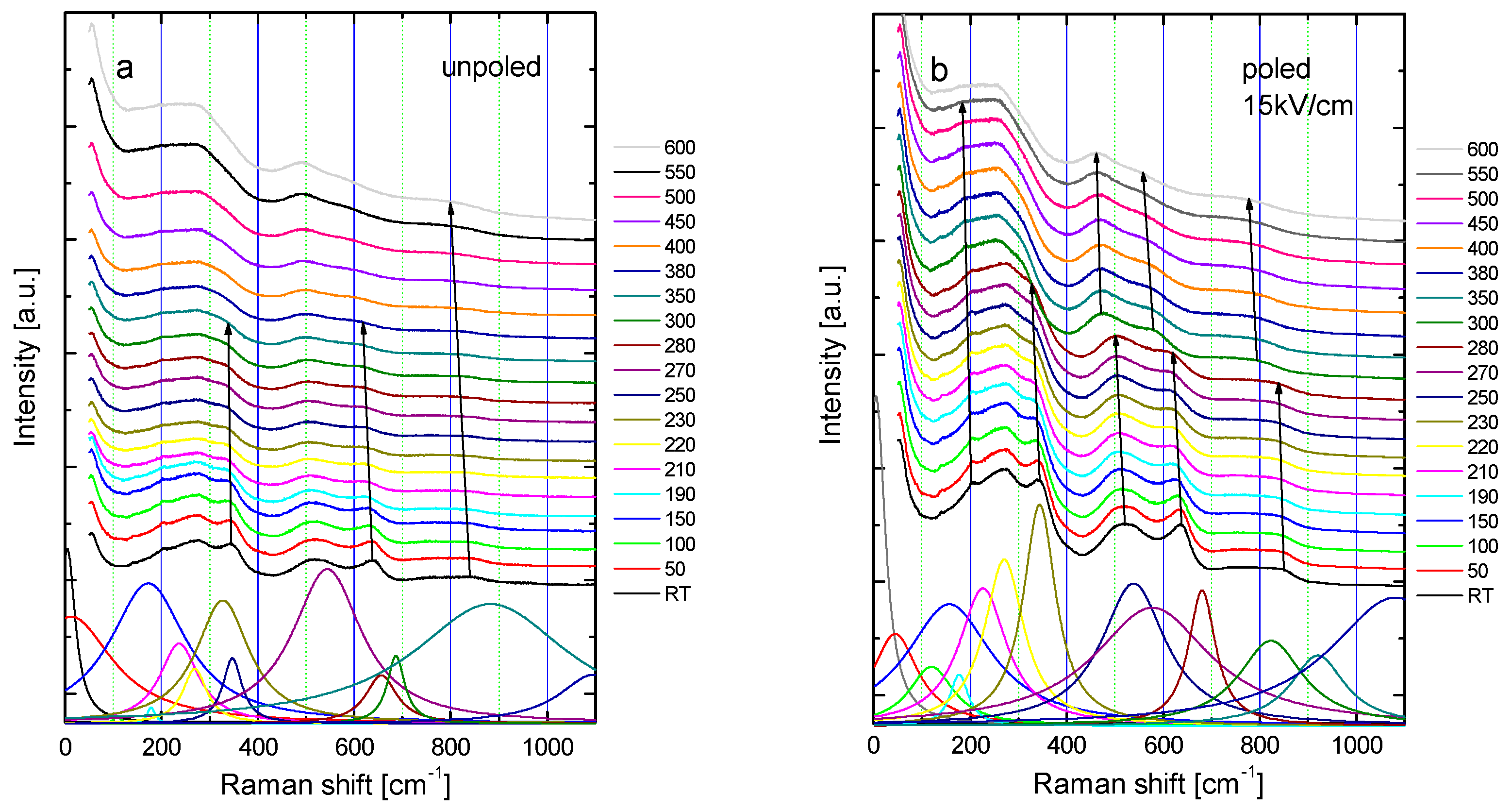 Figure 7b), most modes appear sharper and more symmetric, their intensities increase, and they shift towards lower wavenumbers, indicating a change in crystal structure and/or ferroelectric order. This Raman behavior suggests the development of long-range polar order and an increase in the degree of ordering after E-poling.