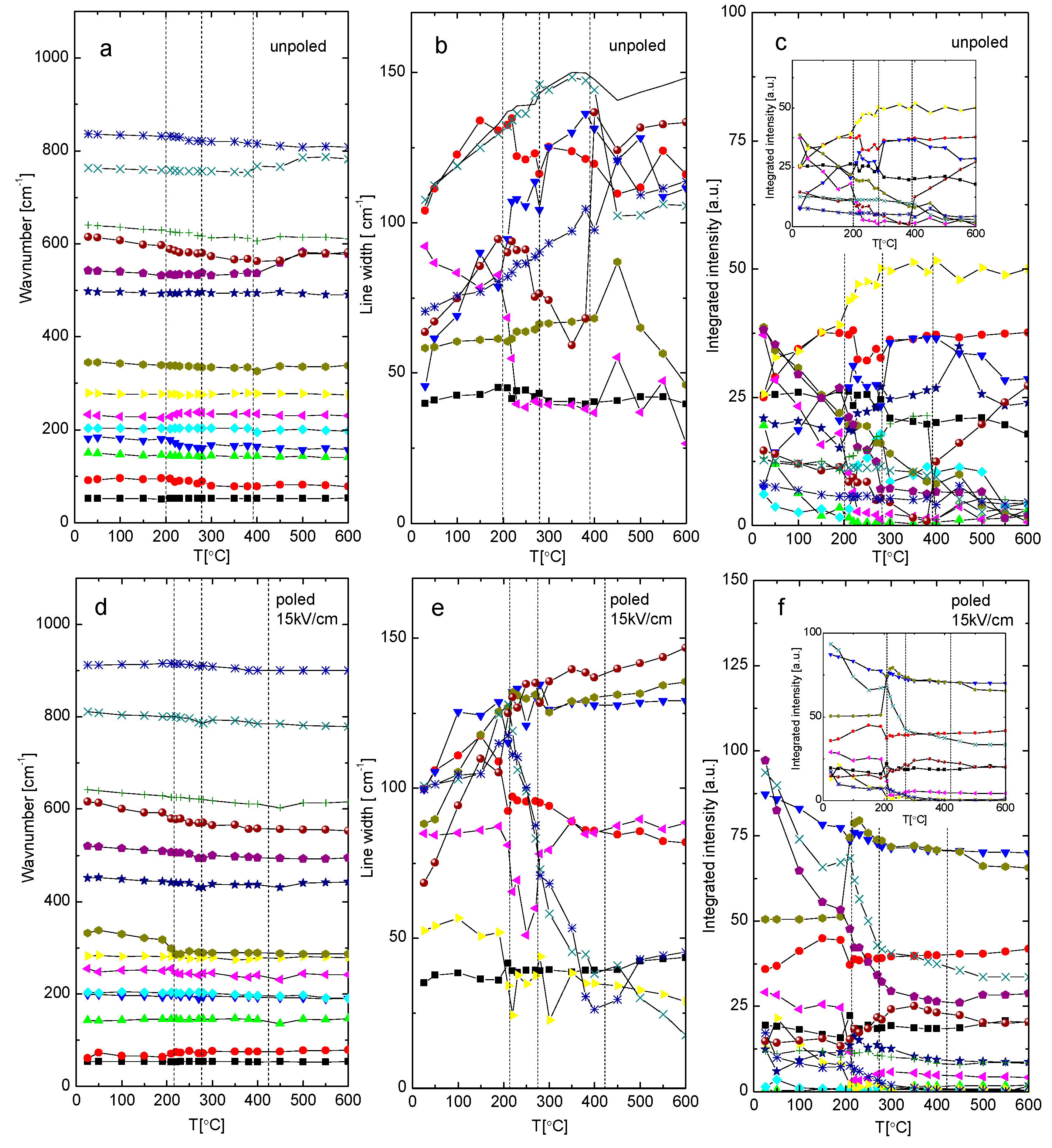 d. Based on the anomalies in the temperature evolution of the wavenumber, linewidth, and intensity, phase transition temperatures were estimated. For the unpoled sample, these temperatures are ~195 °C and ~375 °C for the tetragonal-tetragonal and tetragonal-cubic phase transitions, respectively (