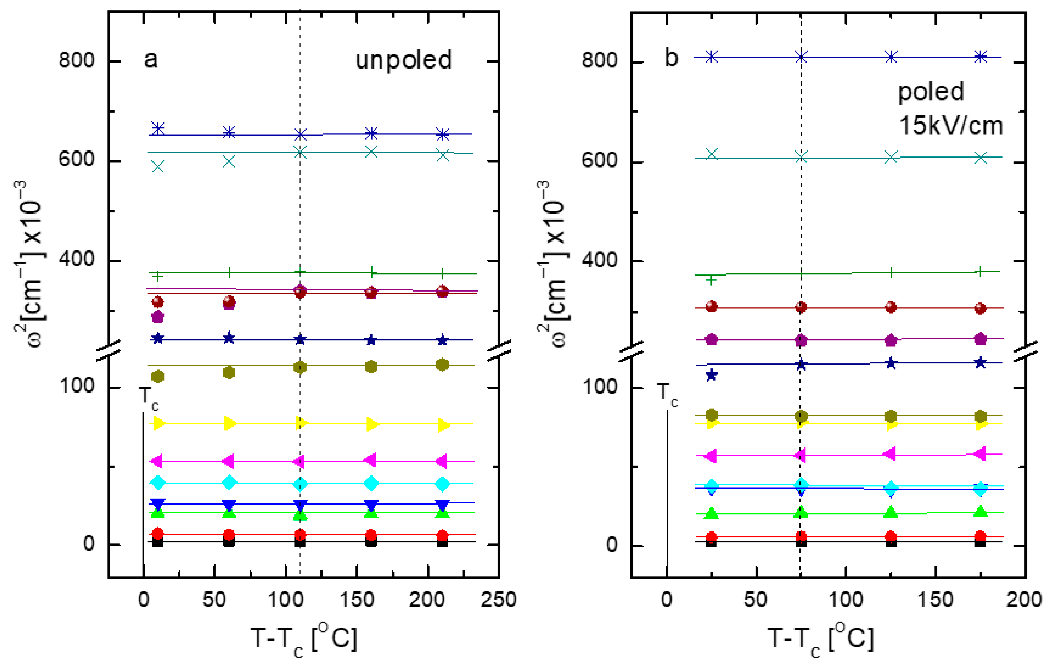 Figure 8a,d) derived from X-ray and dielectric measurements, as previously described. This suggests that the phase transition is mainly of displacive character. According to Cochran’s law, the square of the soft-phonon frequency should be a linear function of temperature: ω