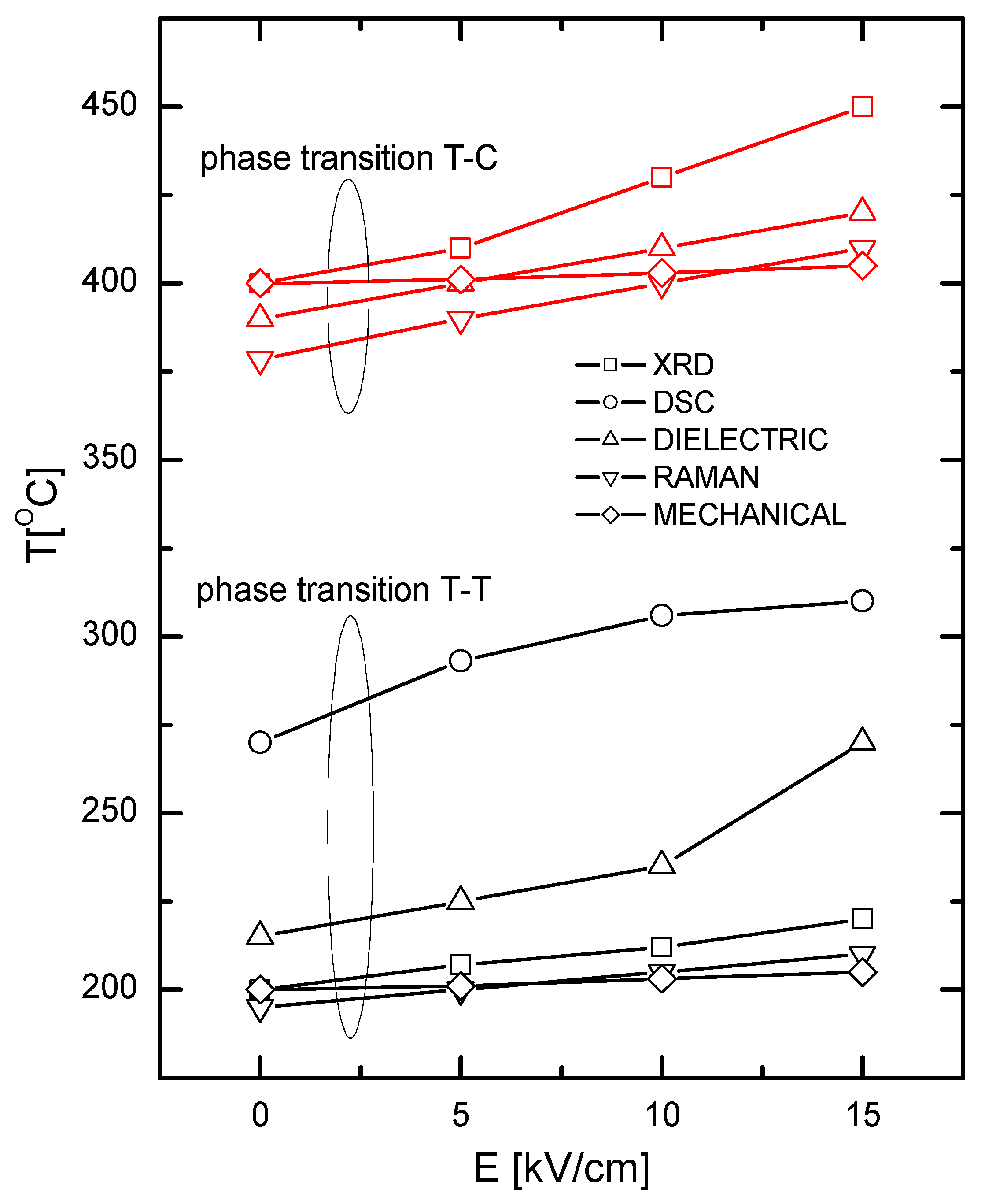 Figure 12. As shown, increasing the electric field intensity has a consistent effect on the temperature for both the tetragonal-tetragonal and tetragonal-cubic phase transitions, displaying an almost linear increase. Excellent agreement between the transition temperatures obtained via different measurement techniques is again clearly evident.