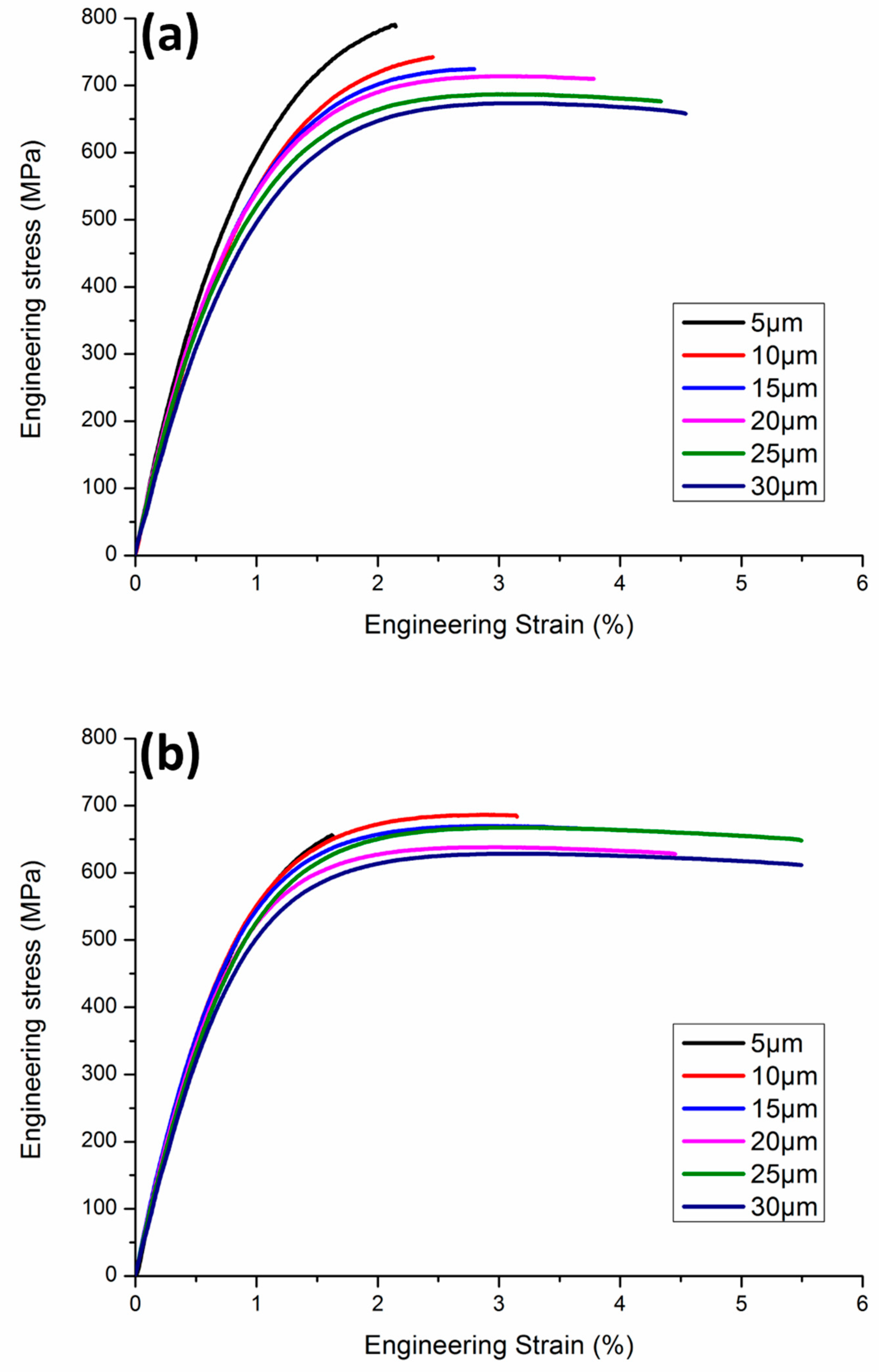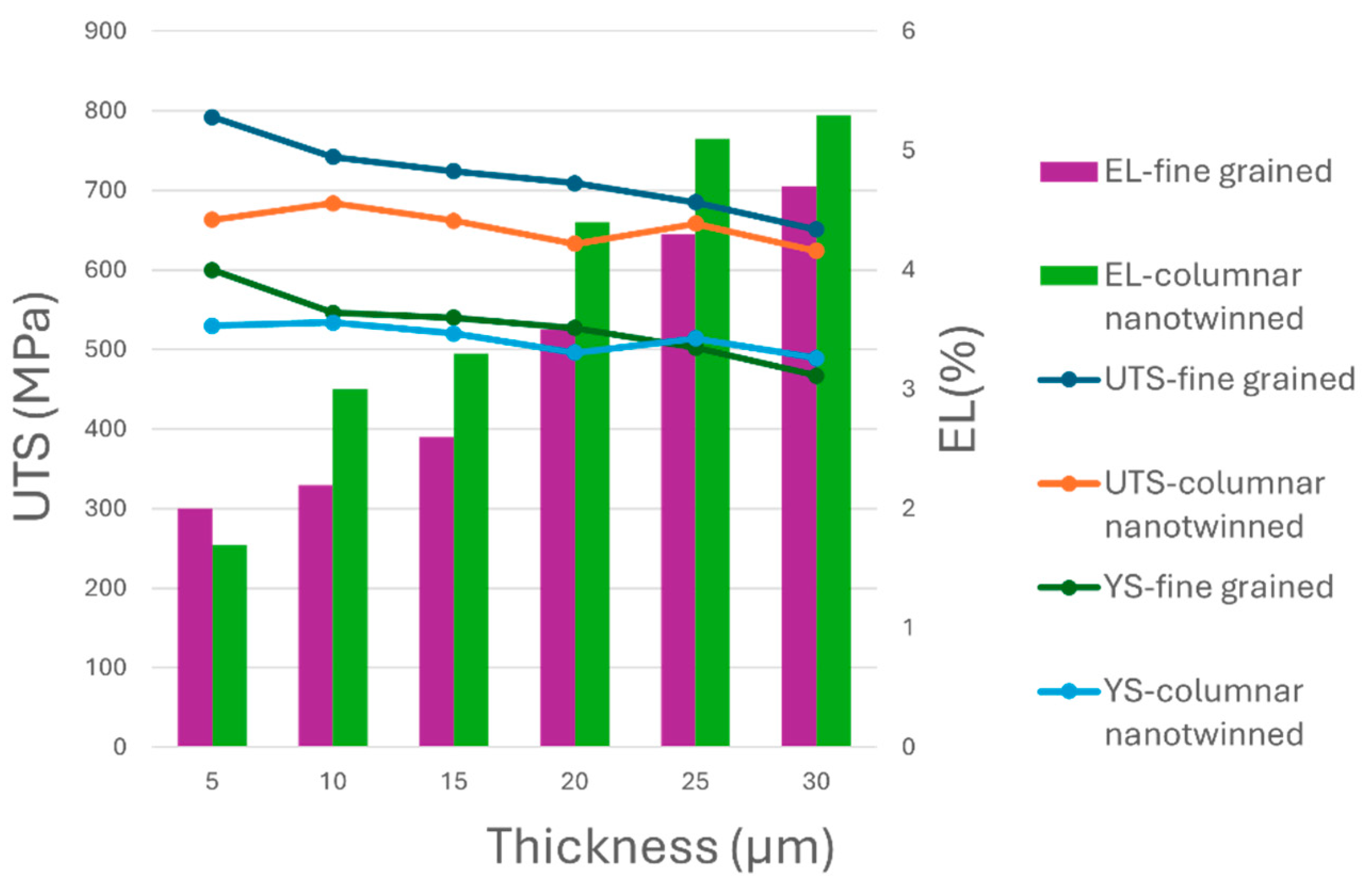 | Thickness (μm) | UTS (MPa) | Percentage Reduction (%) | YS (MPa) | Percentage Reduction (%) | Elongation (%) | Percentage Increase (%) |