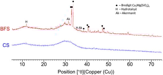 The XRD of copper slag (Figure 3) shows no reflections from crystalline phases, while the characteristic increase in the background within the 2θ angle range from 26° to 38° indicates a high degree of glass transition in the copper slag. This is confirmed by the determined glassy phase content, which is approximately 100% by mass. In turn, the diffraction pattern of granulated blast furnace slag shows quite intense diffraction lines belonging to the crystalline phases present in the slag: akermanite, hydrotalcite, and bredigitite. This indicates a lower degree of glass transition in the slag. The determined glassy phase content in granulated blast furnace slag is approximately 90% by mass and is lower than the glassy phase content in copper slag.
