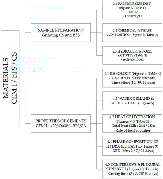 The results of setting time tests (Figure 6) clearly show that both BFS and CS extend the setting time (initial and final) compared to the reference cement. The prolongation is more pronounced with increasing slag content and is slightly greater for BFS. The delayed setting of BFS-blended cement is a well-known phenomenon [33]. and similar effects have also been observed for CS [6,52].