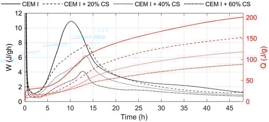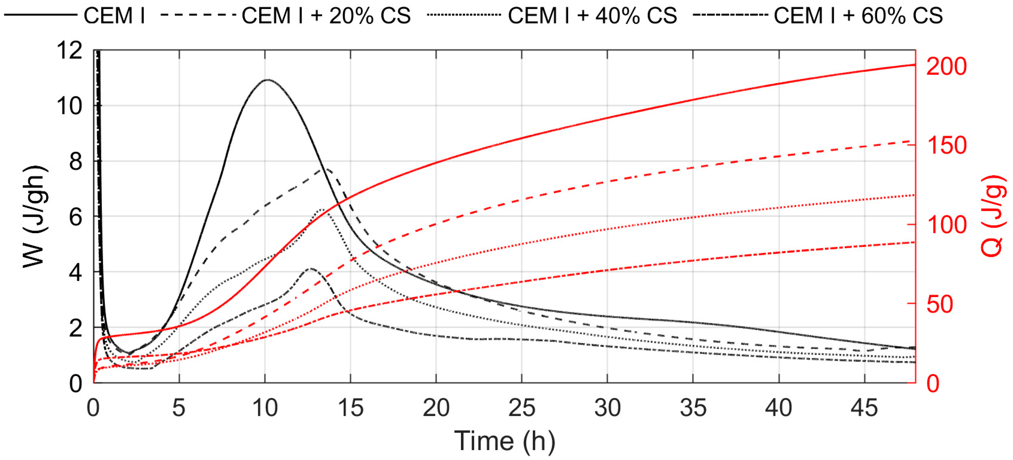 Rate and total heat evolution during hydration of cement containing 20%, 40%, and 60% by mass of CS.