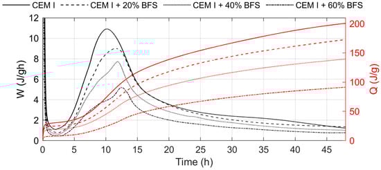 The results of the heat evolution rate tests, for cement pastes containing 20%, 40%, and 60% CS are shown in Figure 7, while the corresponding results for BFS-blended cements (at the same replacement levels) are presented in Figure 8. The total heat release during hydration for all cements is summarized in Table 5.