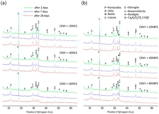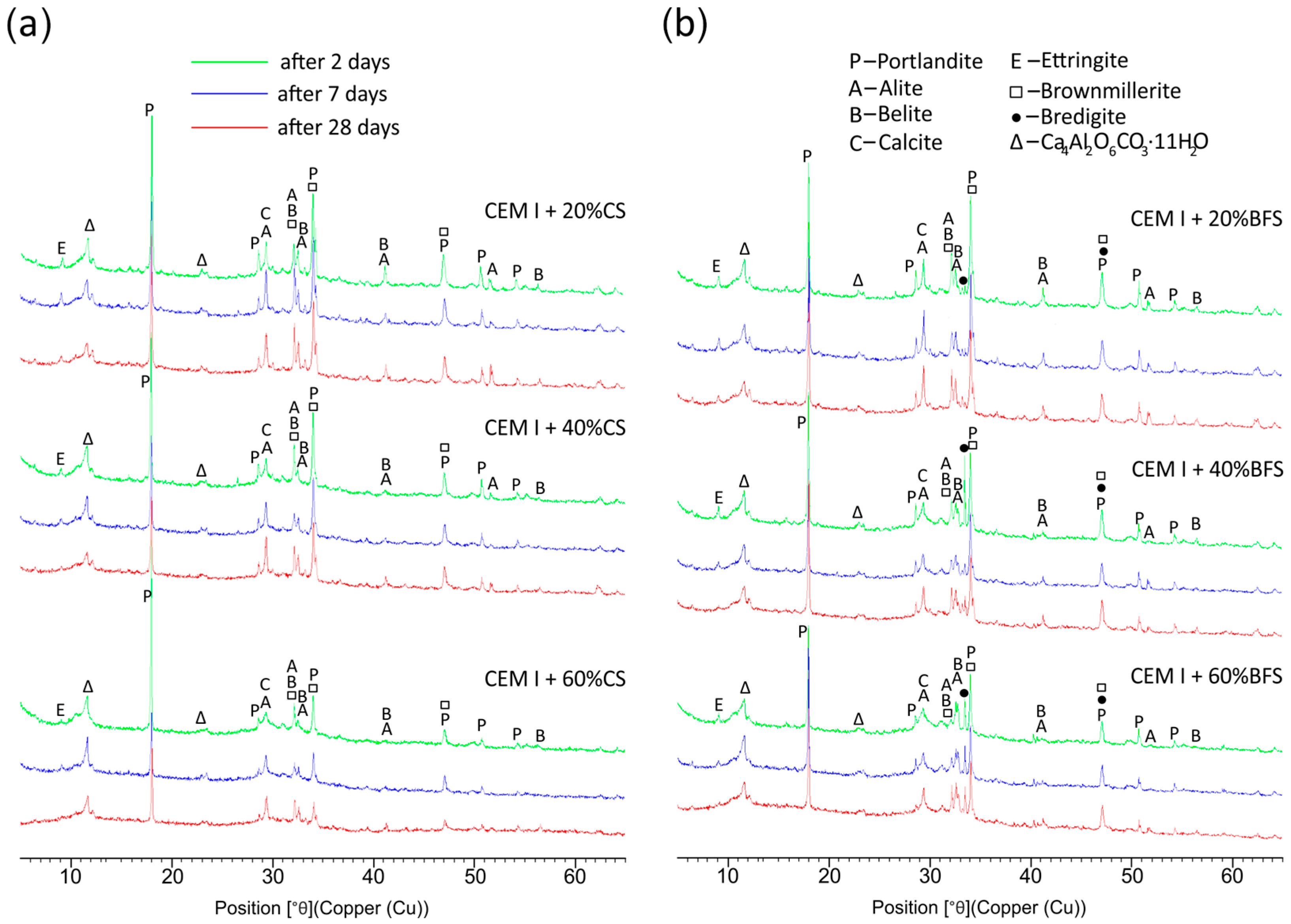 XRD patterns of pastes made with CEM I containing 20%, 40%, and 60% by mass of CS (a) and BFS (b) after 2, 7, and 28 days of hydration.
