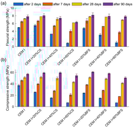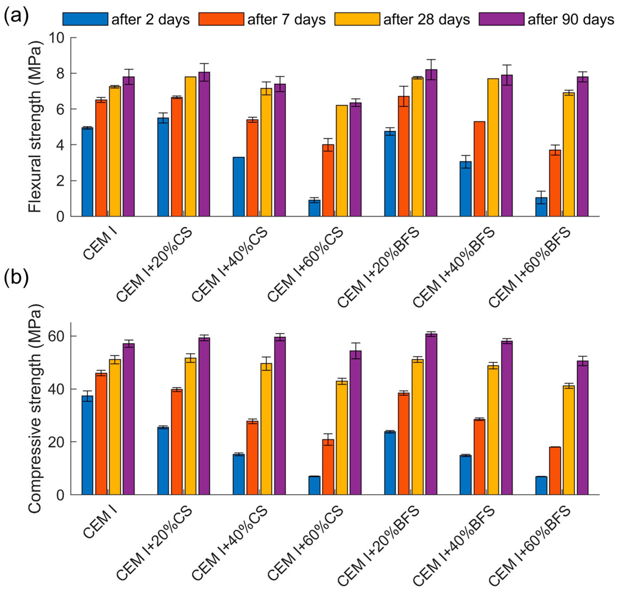 Compressive and flexural strength of mortars containing 20%, 40%, and 60% by mass of CS and BFS after 2, 7, 28, and 90 days of curing: (a) flexural strength; (b) compressive strength.
