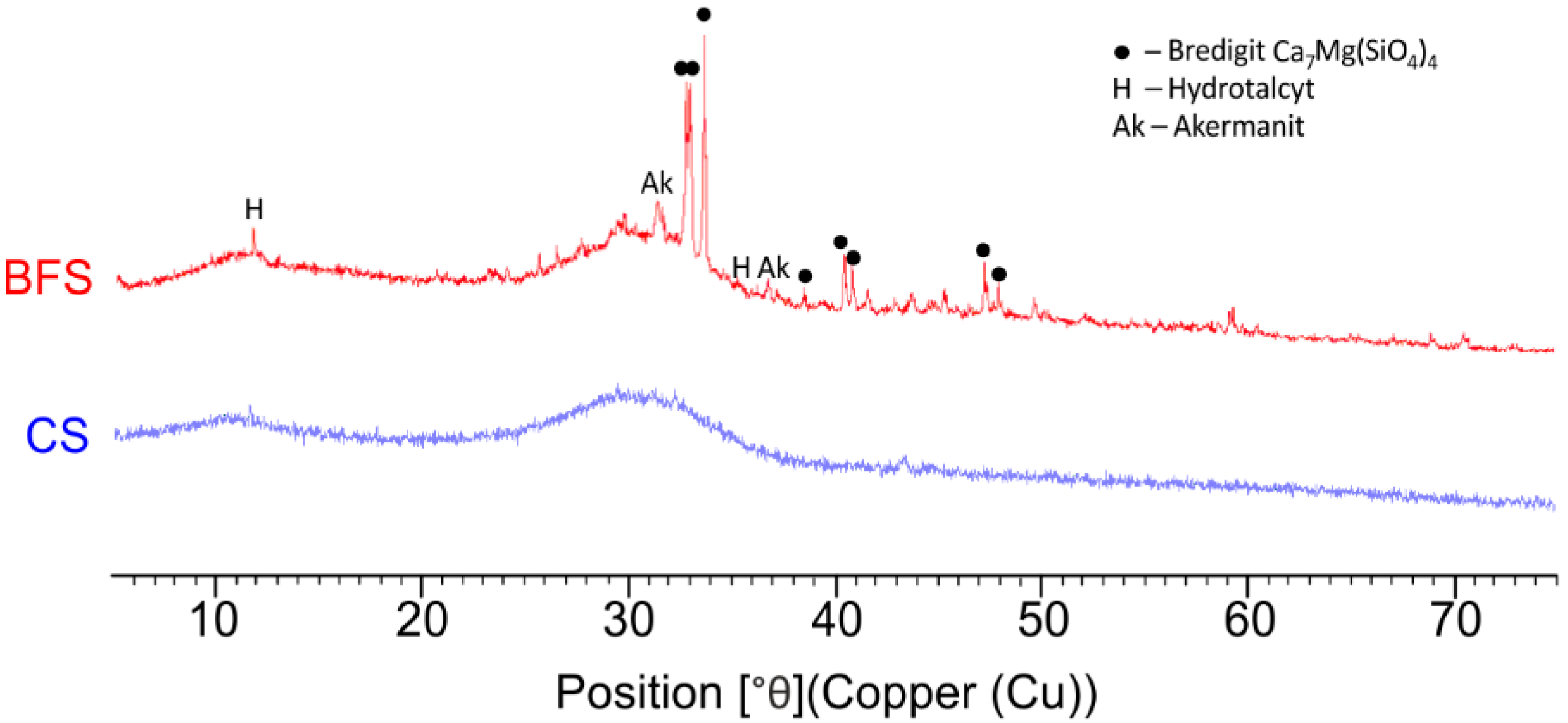 Figure 3) shows no reflections from crystalline phases, while the characteristic increase in the background within the 2θ angle range from 26° to 38° indicates a high degree of glass transition in the copper slag. This is confirmed by the determined glassy phase content, which is approximately 100% by mass. In turn, the diffraction pattern of granulated blast furnace slag shows quite intense diffraction lines belonging to the crystalline phases present in the slag: akermanite, hydrotalcite, and bredigitite. This indicates a lower degree of glass transition in the slag. The determined glassy phase content in granulated blast furnace slag is approximately 90% by mass and is lower than the glassy phase content in copper slag.