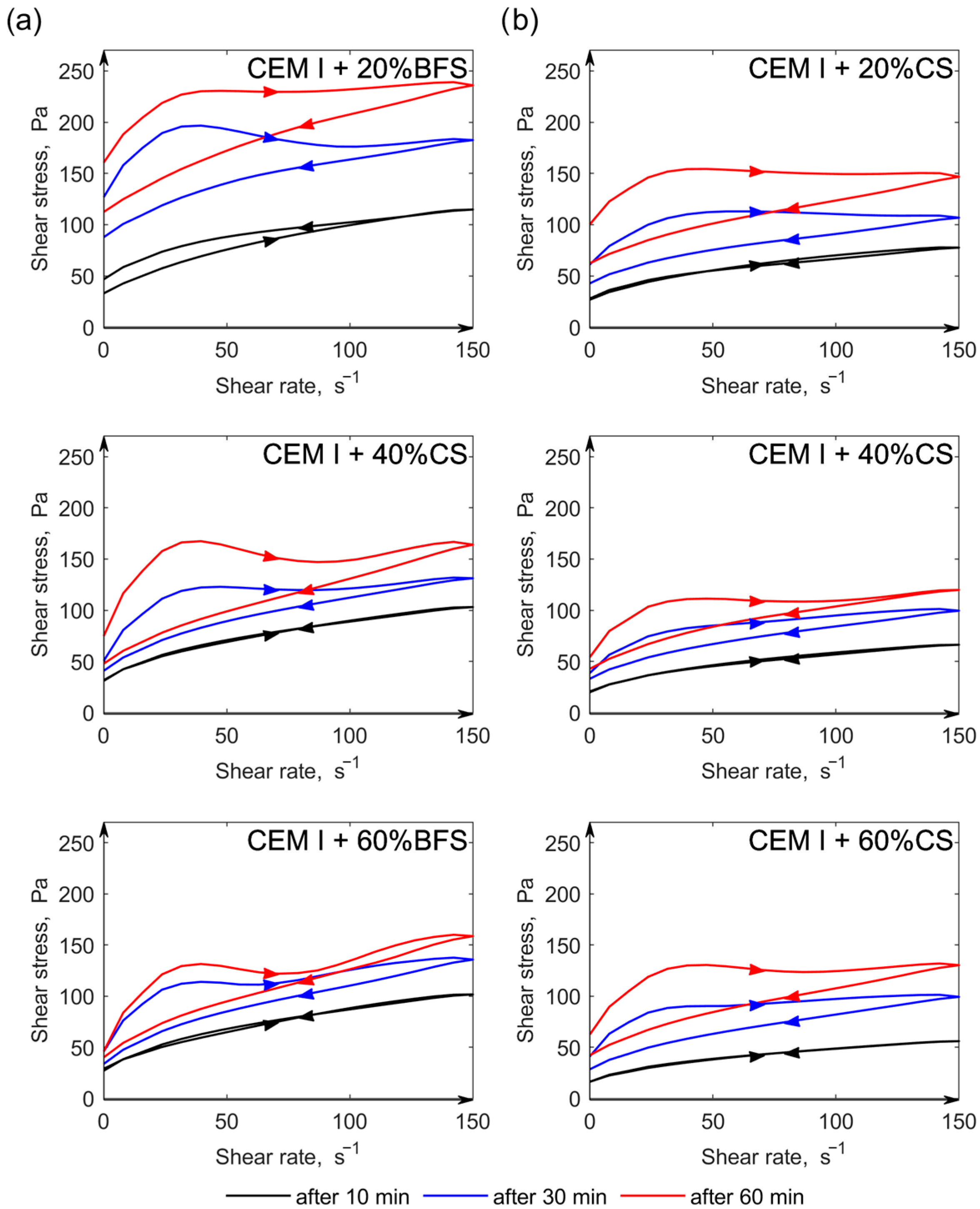 Flow curves of cement pastes: CEM I with 20%, 40%, and 60% by mass of BFS (a) and CS (b), after 10, 30, and 60 min.