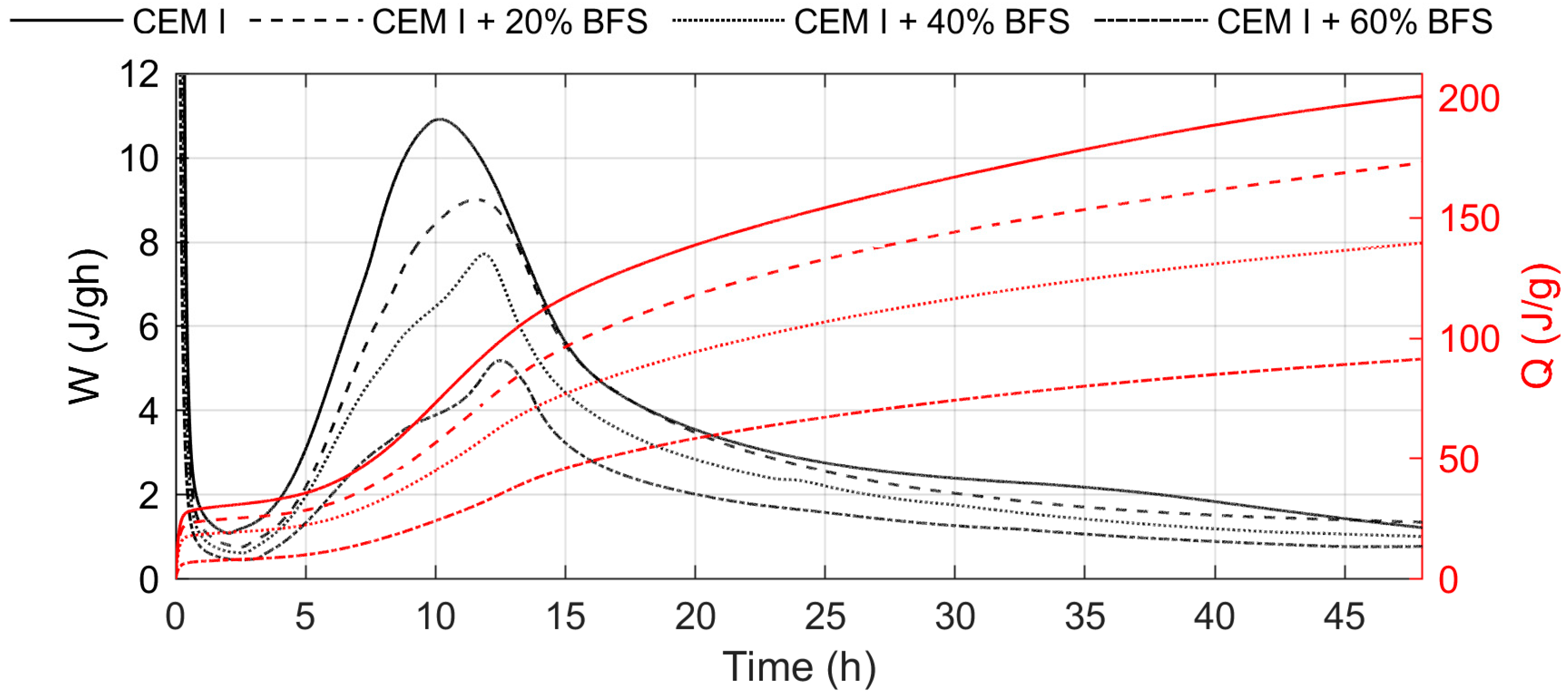 Rate and total heat evolution during hydration of cement containing 20%, 40%, and 60% by mass of BFS.
