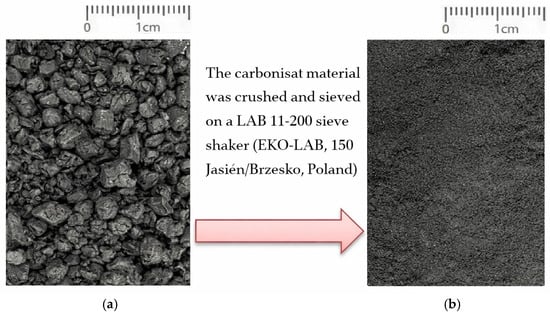 - Preparation of carbonisate: a fraction with particle size < 500 µm was obtained by grinding and sieving on a LAB 11-200 sieve shaker (EKO-LAB, Jasień/Brzesko, Poland), Figure 1.