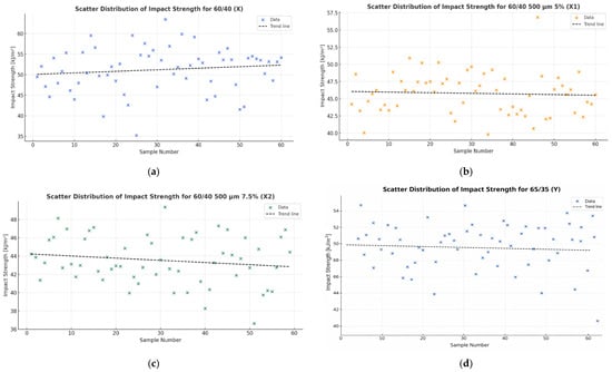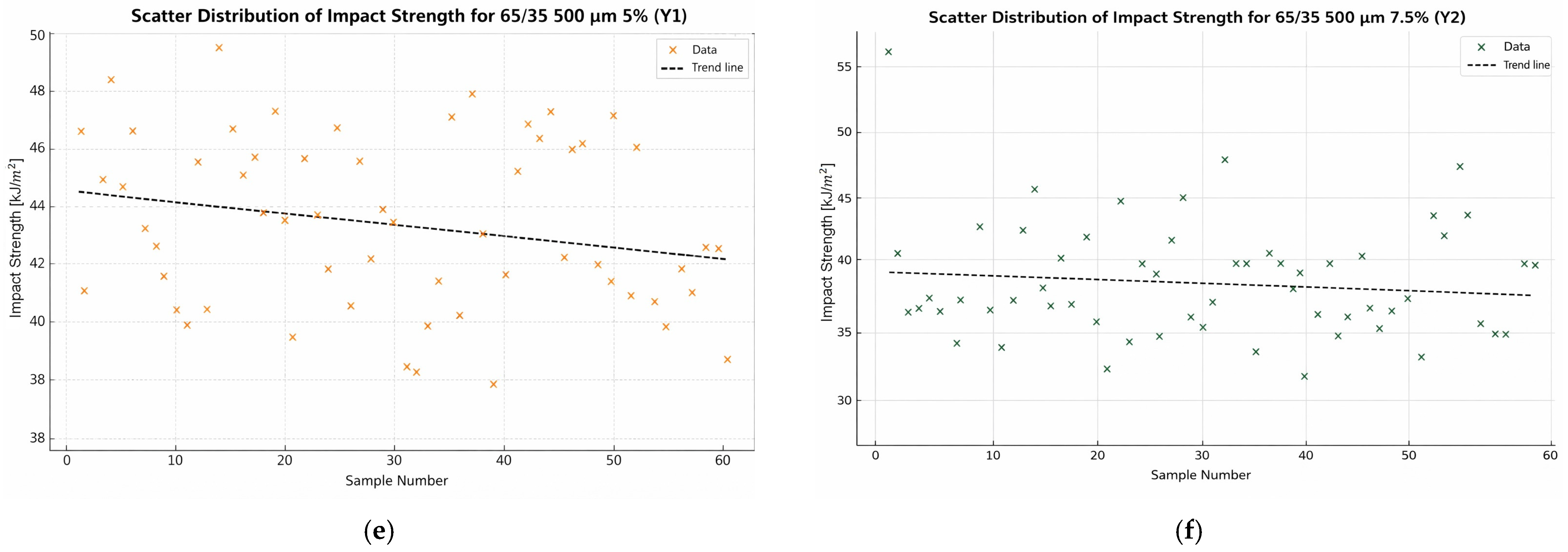 Scatter plots showing the impact strength values [kJ/m2] of composite samples for variant 60/40, (a) X (reference material without carbonisate), (b) X1 (material with 5 wt% carbonisate) and (c) X2 (material with 7.5 wt% carbonisate), and for variant 65/35, (d) Y (reference material without carbonisate), (e) Y1 (material with 5 wt% carbonisate) and (f) Y2 (material with 7.5 wt% carbonisate).