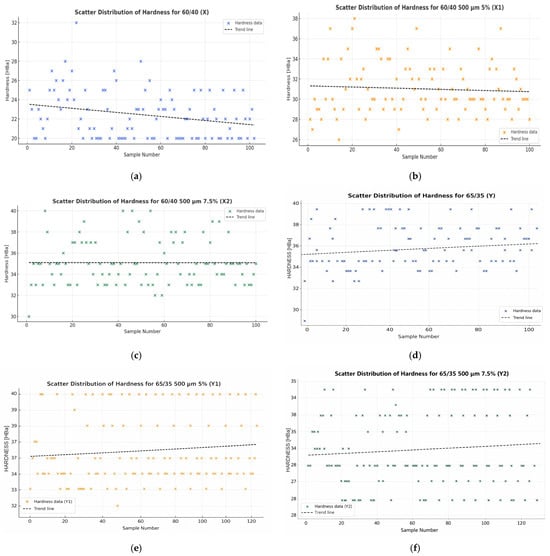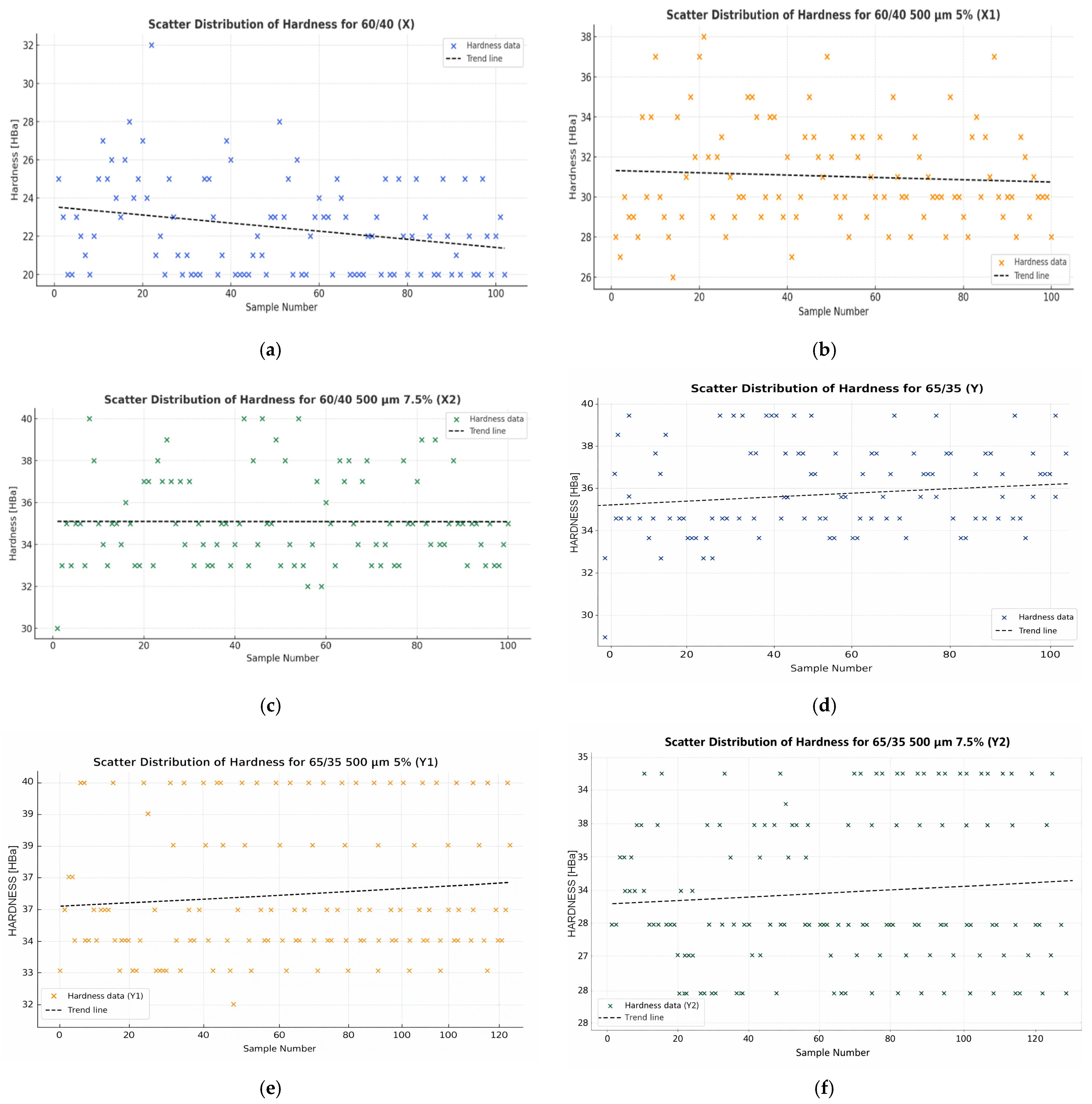 Scatter plots showing the hardness values [HBa] of composite samples for variant 60/40 (a) X (material without carbonisate), (b) X1 (material formulated with 5 wt% carbonisate), (c) X2 (material incorporating 7.5 wt% carbonisate) and of composite samples for variant 65/35 (d) Y (material without carbonisate), (e) Y1 (material formulated with 5 wt% carbonisate), (f) Y2 (material incorporating 7.5 wt% carbonisate).