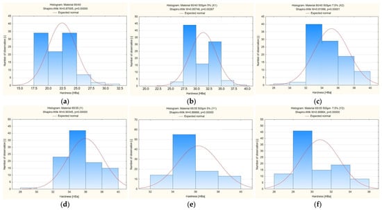 Histograms of the hardness distribution of the tested composite materials (a) material X, (b) material X1, (c) material X2, (d) material Y, (e) material Y1, (f) material Y2.