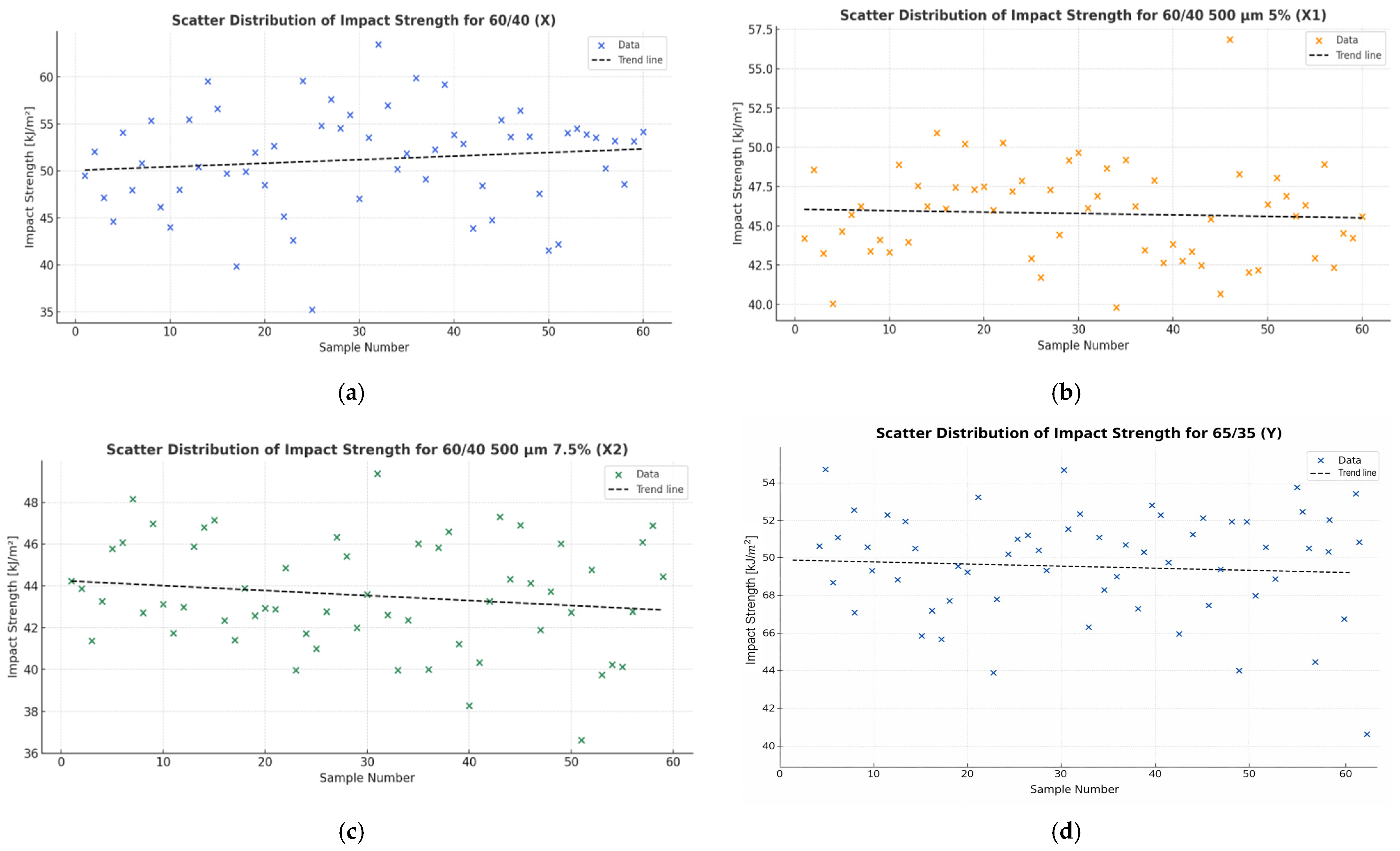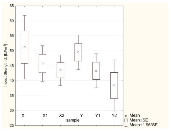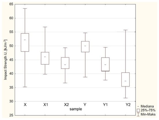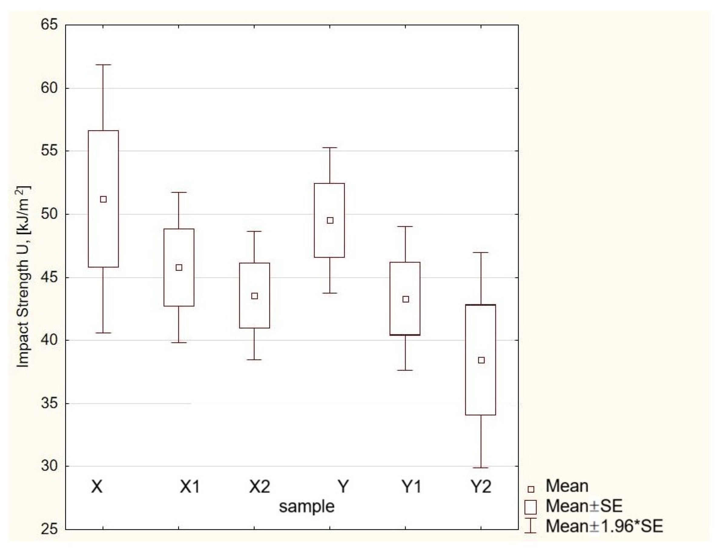 Impact strength measurements were performed for two variants of composite materials. For each variant, 60 samples were prepared (labelled as X, X1, X2 and Y, Y1, Y2). Figure 5 depicts the distribution of impact strength results for the tested materials, while Table 2 compiles the average values recorded in these tests.