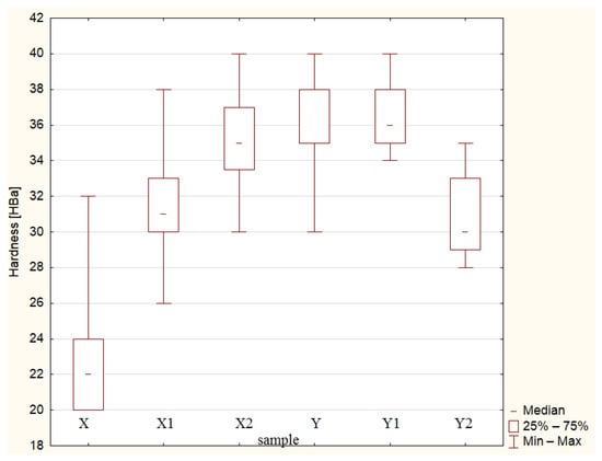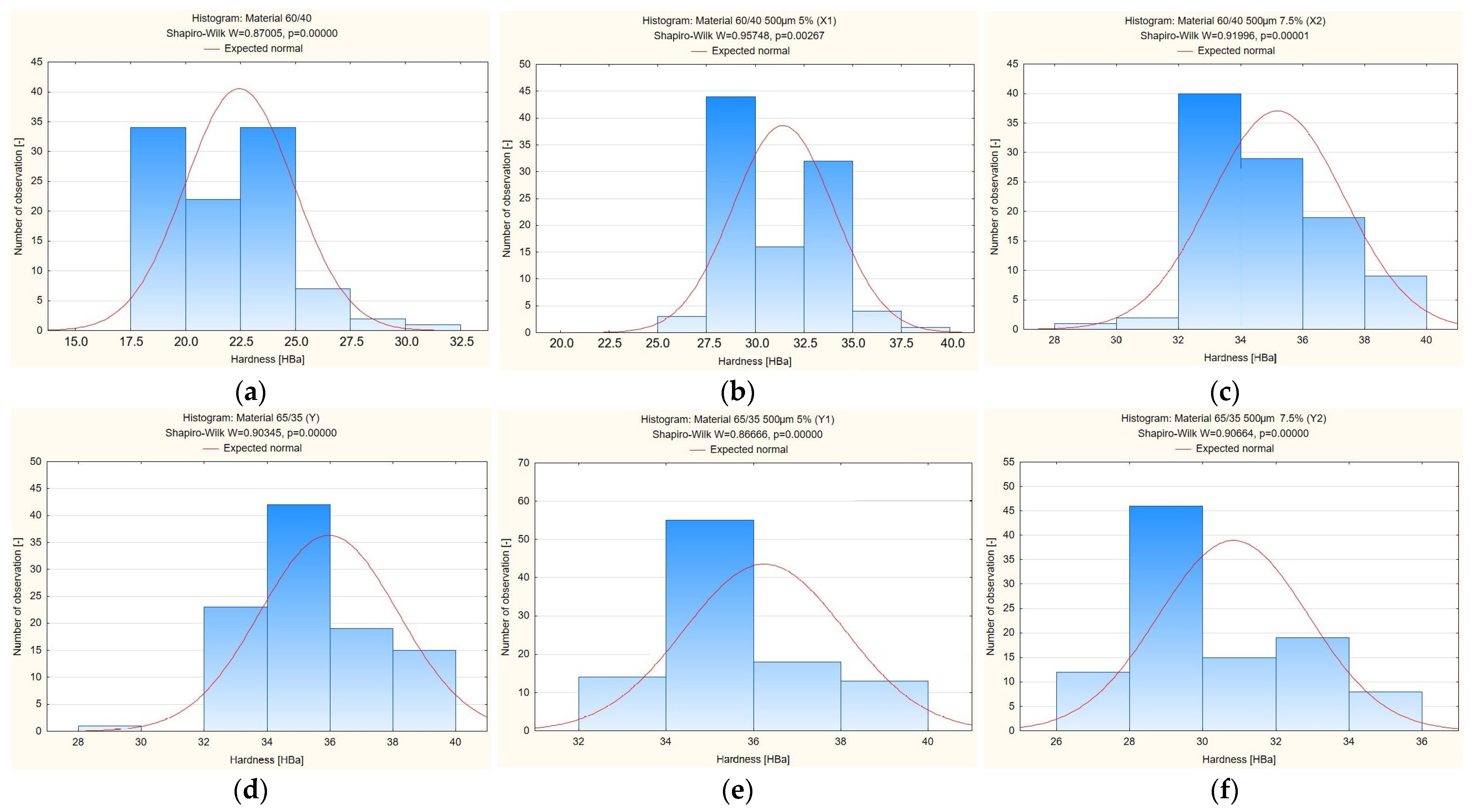 Figure 9 shows histograms of the hardness distribution for the tested composite materials. The results of the Shapiro–Wilk test (Table 6) showed that for all analysed samples, the p-values are less than 0.05, which means that the hardness variable distribution is not normal. The histograms of all samples (X, X1, X2, Y, Y1 and Y2) confirm these results—the distributions are asymmetrical, and in some cases, extreme values are visible. This means that the hardness of the tested composites does not have a normal distribution, and therefore, non-parametric tests must be used for further comparative analyses. The graphical analysis thus confirms the conclusions of the Shapiro–Wilk test presented in Table 6.
