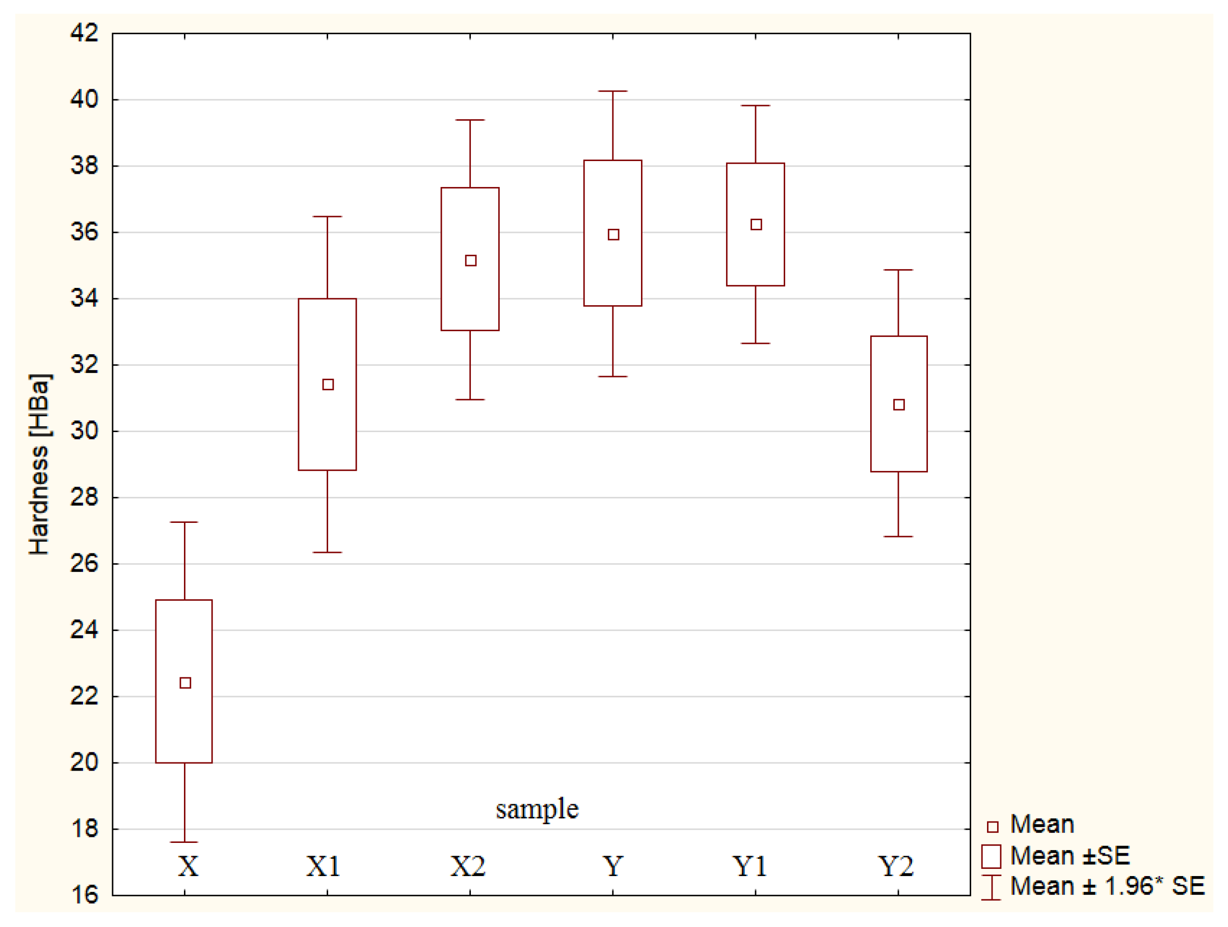 Hardness measurements were performed for two variants of composite materials. For each variant, 100 measurements were performed, marked as X, X1, X2 and Y, Y1, Y2. Figure 7 show scatter plots illustrating the hardness values of the obtained materials. The average hardness values obtained in the tests are summarised in Table 3.