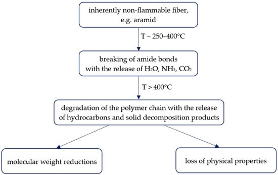 Thermal degradation occurs in both inherently flame-retardant fibres and fibres containing flame retardants. Thermal degradation of aramid fibres occurs through two main mechanisms: chain depolymerisation and amide bond cleavage reaction [43]. As the temperature rises, the amide bonds break down, leading to the release of gaseous decomposition products such as water, ammonia, and carbon dioxide. At higher temperatures, the chain breaks down into smaller fragments; see Figure 2.