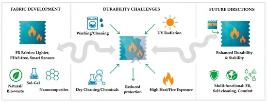 - Qi, P.; Chen, F.; Li, Y.; Li, H.; Gu, X.; Sun, J.; Zhang, S. A Review of Durable Flame-Retardant Fabrics by Finishing: Fabrication Strategies and Challenges. Adv. Fiber Mater. 2023, 5, 731–763. [Google Scholar] [CrossRef]