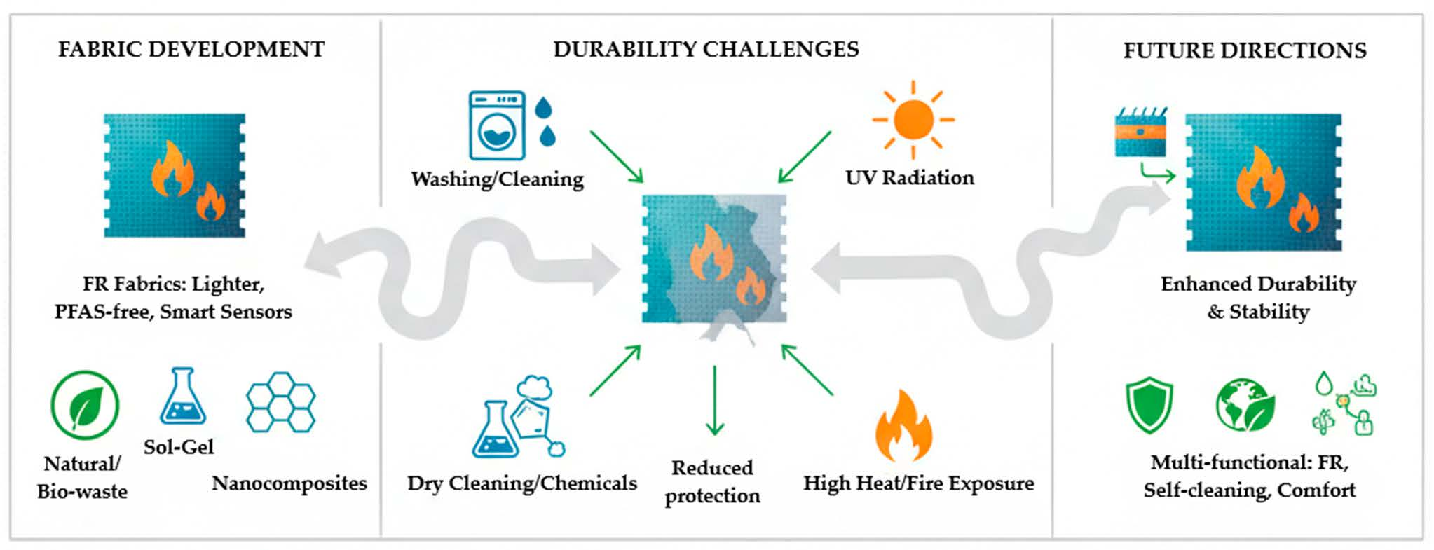 Developments in the textile industry occur both as a consequence of increased awareness among users and various requirements in terms of human and environmental safety. Modifications are aimed at improving performance parameters, using natural substances, moving away from synthetic materials, and improving ergonomics. In order to achieve this, various fibre-production techniques are used, as is the addition of substances, including nanosubstances, into the structure or onto the surface of a given material. In the case of fire-resistant fabrics, which primarily must meet thermal protection requirements, efforts are also being made to reduce weight and eliminate harmful chemicals (e.g., polycyclic aromatic hydrocarbons PAHs), and to create smart materials with sensors. However, it is necessary to further develop not only the materials themselves but also cleaning and decontamination techniques that will allow the fire resistance parameters that have been developed to be maintained.
