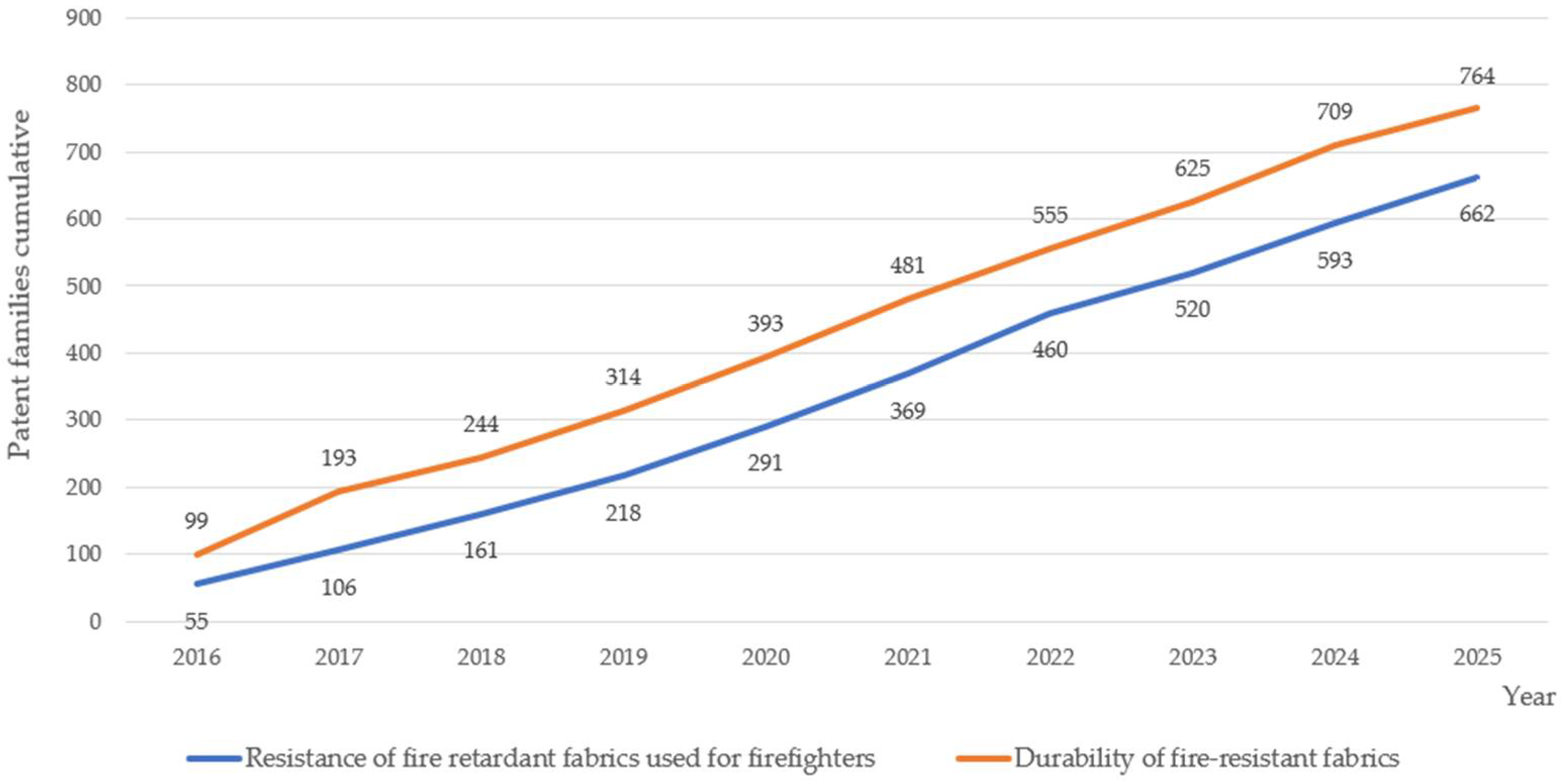 The research also included Espacenet, Patentscope, and Google Patents, and searched the years 2016–2025 (until 31 October 2025), which resulted in the identification of selected patents relevant to the subject. For example, in the Espacenet search, there were 764 results found for the keywords ‘durability of fire-resistant fabrics’ and 662 results for the keywords ‘resistance of fire-resistant fabrics used for firefighters’; see Figure 1.