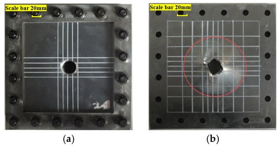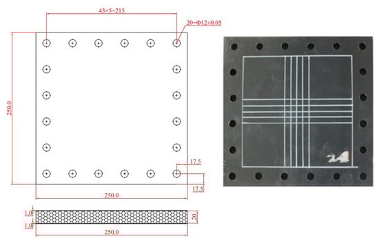 The AFSPs sample, as shown in Figure 2, has overall dimensions of 250 mm × 250 mm with an effective internal area of 180 mm × 180 mm. The face sheet and the core layer are bonded with a self-prepared epoxy resin adhesive, and the epoxy resin and curing agent are modulated according to a 1:1 ratio to form an epoxy resin adhesive. Try to ensure that the amount of epoxy resin adhesive on the upper face sheet and lower face sheet is the same. The prepared epoxy resin adhesive is evenly applied to the face sheet, and then the core layer is placed between the upper and lower face sheet. Heavy objects were used to press on the upper face sheet to ensure close contact between the core layer and the face sheet. After the epoxy resin adhesive is cured, the manufacturing process of the aluminum foam sandwich plate is completed. A grid pattern with 10 mm spacing was marked at the center of each specimen to facilitate observation of deformation and failure modes. Each sample consists of three components: upper and lower face sheets with a thickness of 1 mm made of 5005H aluminum alloy, and a 20 mm thick aluminum foam core.