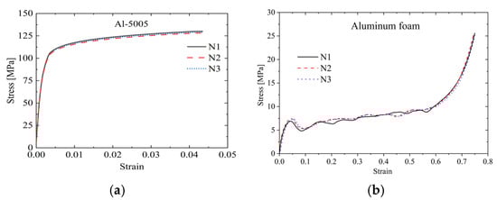 To obtain the material parameters of the aluminum alloy (face sheet) and aluminum foam (core layer), compression and tensile tests were conducted using the Universal Testing Machine, respectively. Figure 3a presents the tensile stress–strain curve of the 5005H aluminum alloy, while Figure 3b shows the compressive stress–strain curve of the aluminum foam.
