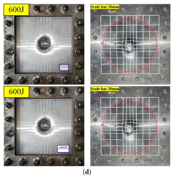 As for the large impactor condition (D40), impact tests were conducted at four different energy levels: 200 J, 400 J, 500 J, and 600 J. The failure modes and dynamic responses of the AFSPs were analyzed under these varying impact energies.
