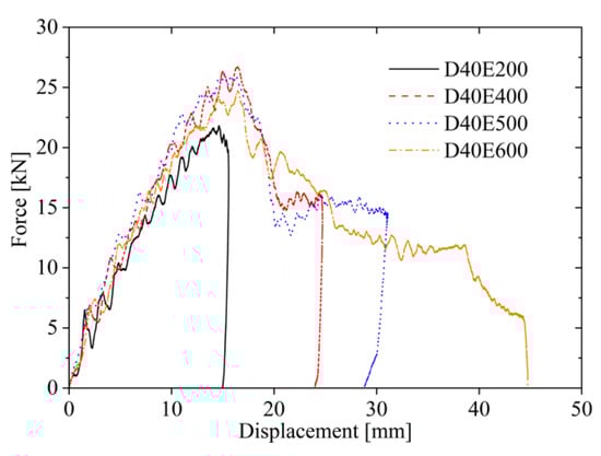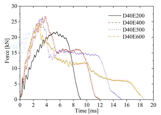 As shown in Figure 6, the displacement of the impactor increases over time, but the growth rate of the displacement curve gradually decreases until reaching the maximum displacement. In this figure, the dashed line represents the maximum value of the displacement. Higher impact energy results in larger displacement. As the impact energy increases, the growth rate of the displacement curve rises, and the time to reach maximum displacement extends, accompanied by the peak value of the displacement curve increasing. At impact energy of 200 J, the displacement grows with time, but due to the release of elastic energy stored in the AFSPs, partial deformation recovery occurs, leading to reduction in displacement; the final displacement is 0.8 mm less than the maximum displacement, namely a phenomenon known as “rebound”. Similarly, at 400 J, the release of stored elastic energy in the sandwich plates also causes rebound. Likewise, at 500 J, the displacement decreases after reaching its peak, and the extent of displacement reduction increases with higher impact energy; the final displacement of the D40E500 curve is reduced by 2.2 mm compared to the maximum displacement value, making the rebound effect more pronounced. However, at 600 J, due to the plastic failure caused by the fracture of the lower face sheet, there is no “rebound” phenomenon.