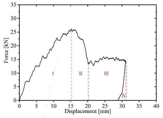 In the first stage (stage I), the force–displacement curves under all four energy levels are in the loading phase, exhibiting nearly identical loading stiffness. In the second stage (stage II), the impactor under the lowest energy separates from the upper face sheet during unloading, while those under the three higher energies penetrate the upper face sheet, with the impact force gradually decreasing due to friction. When the upper face sheet fractures while the lower face sheet remains intact, the force–displacement curve exhibits four typical stages, as shown in Figure 9. In the third stage (stage III), as the core layer compresses, the force–displacement curves for 400 J, 500 J, and 600 J display a plateau region. In the fourth stage (stage IV), the curves for 400 J and 500 J undergo unloading, whereas the 600 J impactor penetrates the lower face sheet. As illustrated in Figure 8, the 600 J force–displacement curve lacks an unloading phase, with the impact force gradually decreasing as displacement increases during lower face sheet penetration. The plateau region is shorter for 400 J but longer for 600 J, indicating that the plateau region expands with larger impact energy. The 400 J energy is insufficient for the impactor to contact the lower face sheet, whereas the 600 J impactor fully compacts the core layer and acts on the lower face sheet, causing its fracture and gradual decline in impact force with increasing displacement. In Figure 9, the red dashed line represents the value of displacement for the end of each stage.