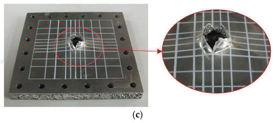 Failure of AFSPs under the action of D25. (a) Failure of front face sheet; (b) failure of lower face sheet; (c) rupture of lower face sheet.