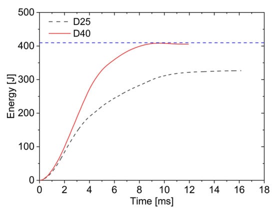 The energy absorbed by the sandwich plates gradually increases with impact duration in Figure 12, with the energy absorption rate being higher for the D40 than the D25. In this figure, the blue dashed line represents the maximum value of the energy absorption. When using the D40, nearly all energy is absorbed by AFSPs. Since the lower face sheet remains unpenetrated under D40 impact, the stored elastic energy from core compression is released, causing a slight decrease in the energy absorption curve. In contrast, D25 retains residual velocity after penetrating the lower face sheet, with the AFSPs absorbing only 326.6 J of energy; the absorbed energy was reduced by about 18%. Smaller impactor diameters result in easier plate penetration and consequently lower energy absorption.