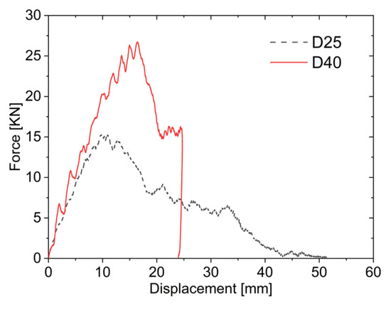 As illustrated in Figure 14, during the loading phase, the slope of the force–displacement curve for the larger impactor is slightly steeper, indicating that the loading stiffness of the larger impactor is greater than that of the smaller impactor. Subsequently, as the core layer is compressed, the force–displacement curve of the larger impactor exhibits a plateau phenomenon. Due to the larger diameter of D40, the contact area between the impactor and the sandwich plates is greater, resulting in a more pronounced plateau region. However, the residual impact energy after the fracture of the upper face sheet is relatively low, leading to a shorter plateau stage. In contrast, the contact area between D25 and the sandwich plates is smaller, and the reaction force from the aluminum foam core during compression is smaller. As a result, the impactor quickly comes into contact with the lower face sheet, which begins to provide resistance, leading to the plateau region showing less distinct. After the core layer is fully compacted, the impactor of D25 penetrates the lower face sheet. The impact of D25 on the lower face sheet causes its fracture, leading to gradual decline in impact force with increasing displacement, as energy is dissipated through friction between the impactor and the lower face sheet. Consequently, the impact force of the smaller impactor decreases progressively with displacement.