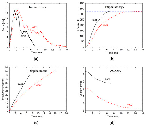 Figure 15d displays the impact velocity–time history curves. The impact velocity decreases gradually over time with diminishing reduction rates. Both energy levels result in residual velocities, with the 800 J impact exhibiting notably higher residual velocity.