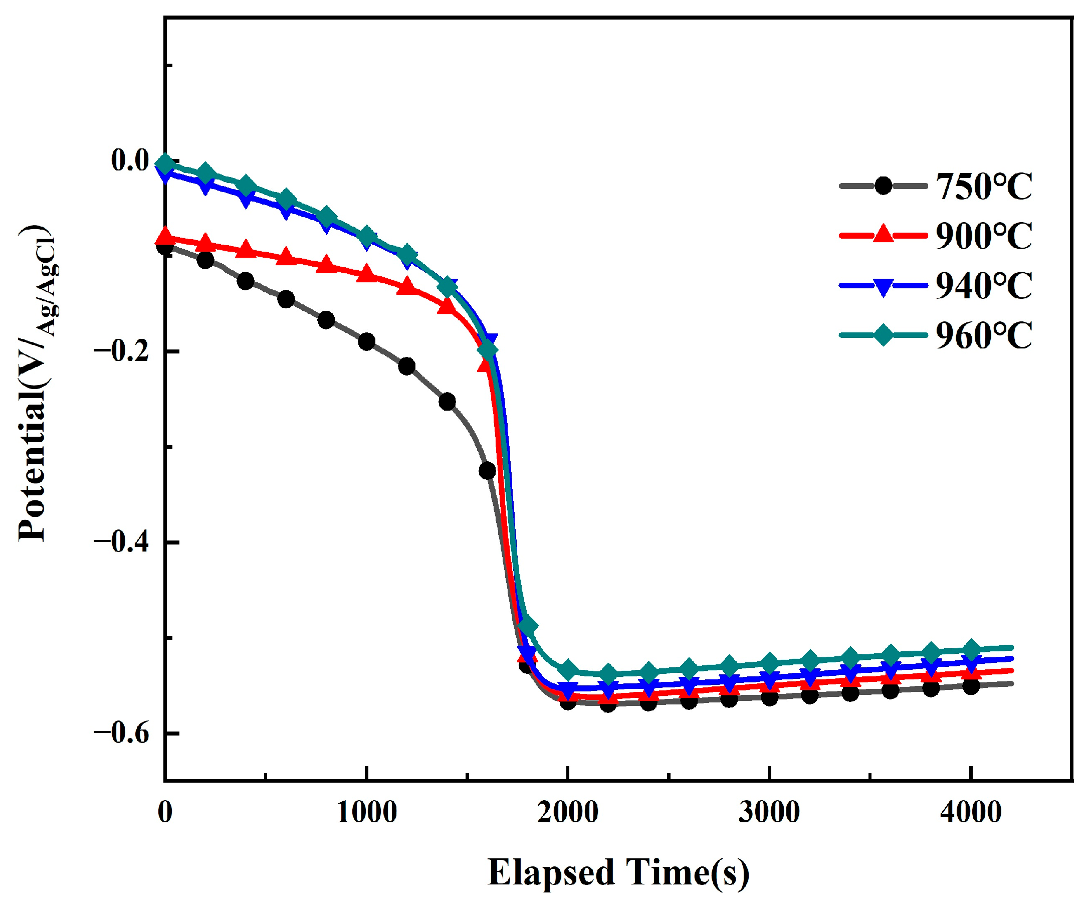 - Potentiodynamic polarization curves reveal that all solution-treated Ti90 alloys undergo an active-to-passive transition in 5 M HCl solution. With increasing solution temperature, the Ecorr shifts positively, while the icorr decreases from 97.57 μAcm−2 to 38.50 μAcm−2, and the ipass decreases from 97.57 μAcm−2 to 38.50 μAcm−2, indicating progressively improved corrosion resistance.