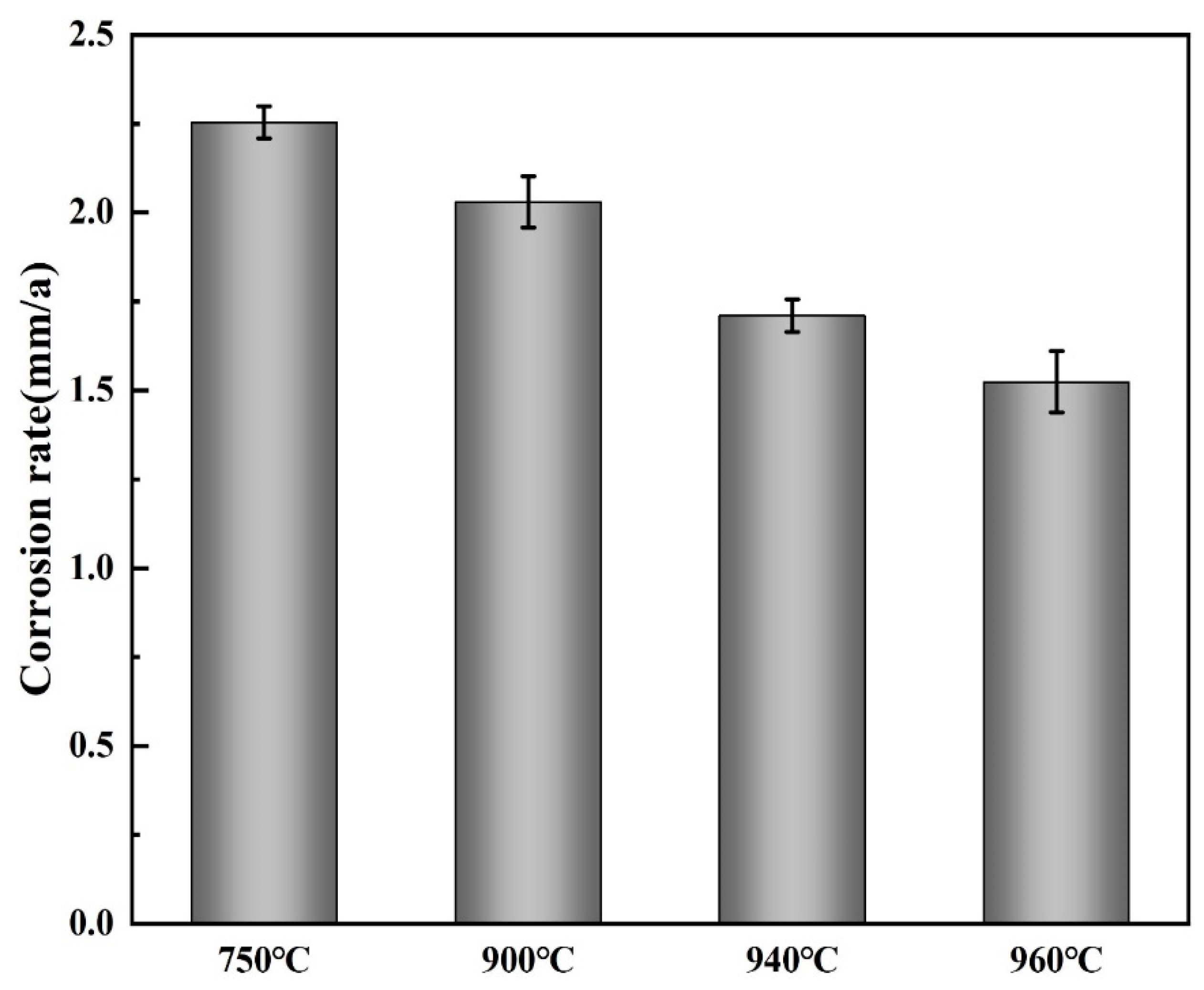 - Static immersion tests show that the corrosion rate decreases from 2.25 mm/a to 1.52 mm/a with rising solution temperature, consistent with electrochemical measurements. The α phase is found to dissolve preferentially during corrosion.