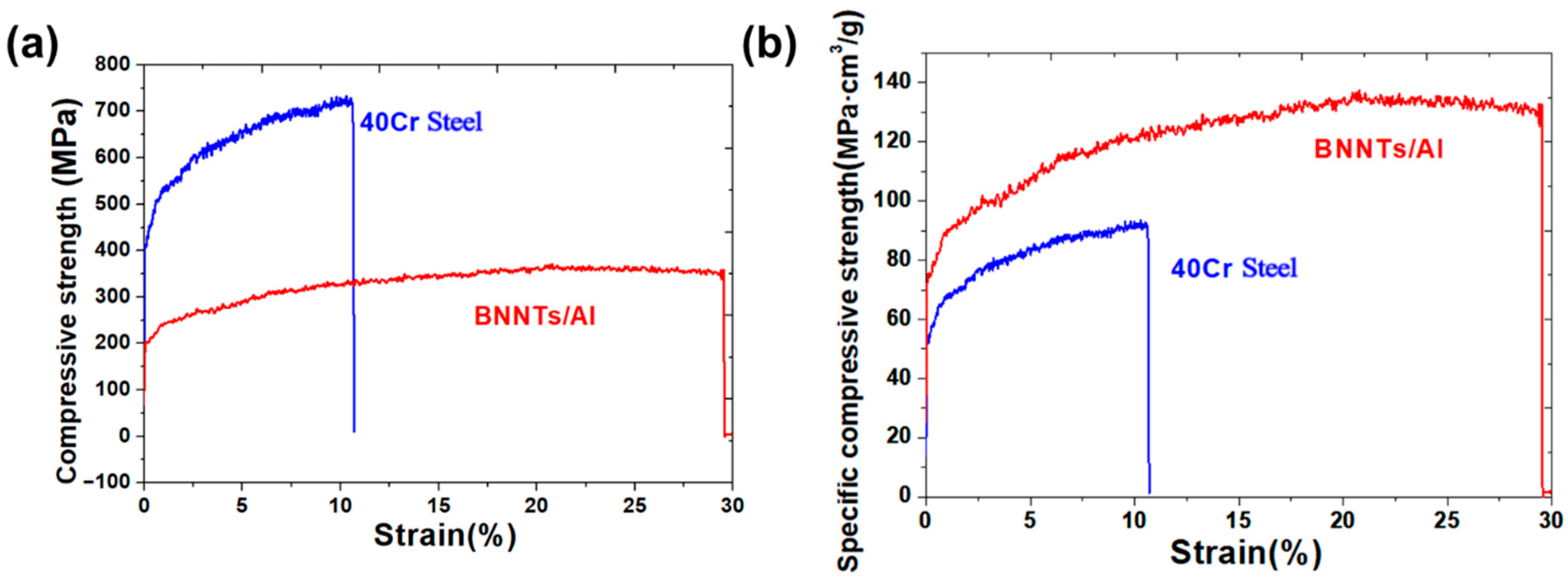 Figure 8, a comparison is presented of performance test results under compressive loading for the BNNTs/Al composite and 40Cr steel. As demonstrated in