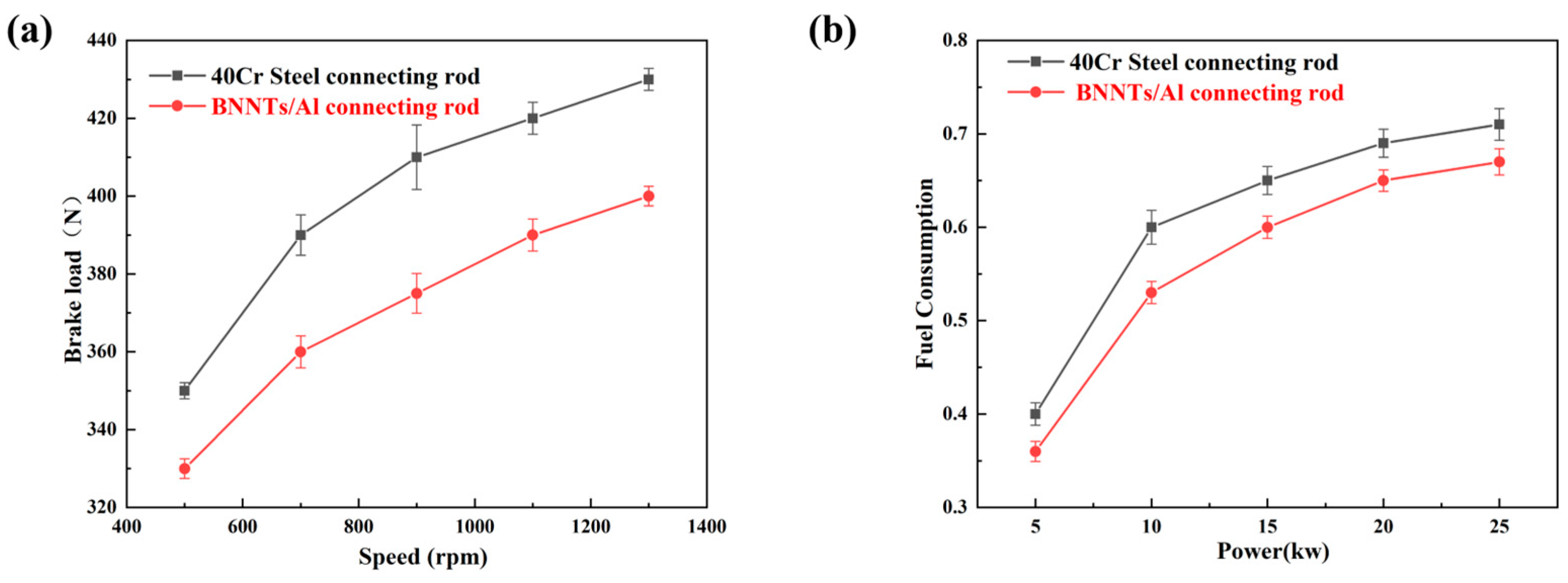 Fuel economy is a pivotal metric in evaluating the efficiency of automotive powertrains. In the context of dwindling fuel reserves, the enhancement of engine efficiency and the reduction of fuel consumption are of paramount importance for the conservation of resources and the protection of the environment. As a moving component within the engine, the weight and inertial forces of connecting rods directly impact fuel consumption. This section draws parallels between the fuel consumption of 40Cr steel connecting rods and BNNTs/Al connecting rods at varying power levels, thereby elucidating the energy-saving mechanism of material lightweighting. As demonstrated in