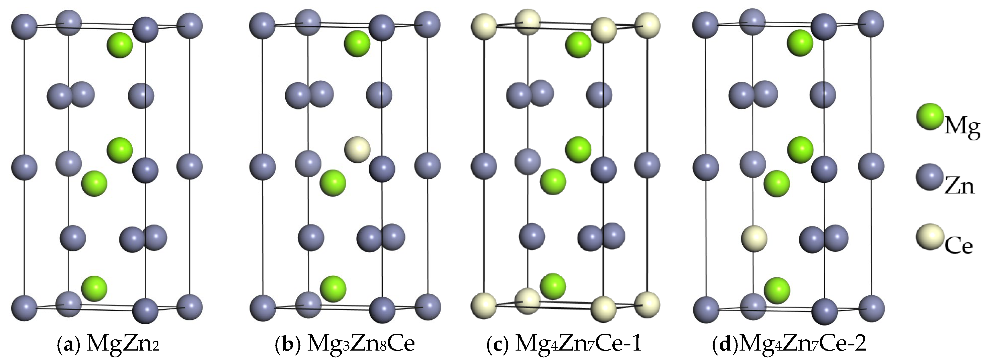 - Xie, Y.-P.; Wang, Z.-Y.; Hou, Z.-F. The phase stability and elastic properties of MgZn2 and Mg4Zn7 in Mg–Zn alloys. Scr. Mater. 2013, 68, 495–498. [Google Scholar] [CrossRef]