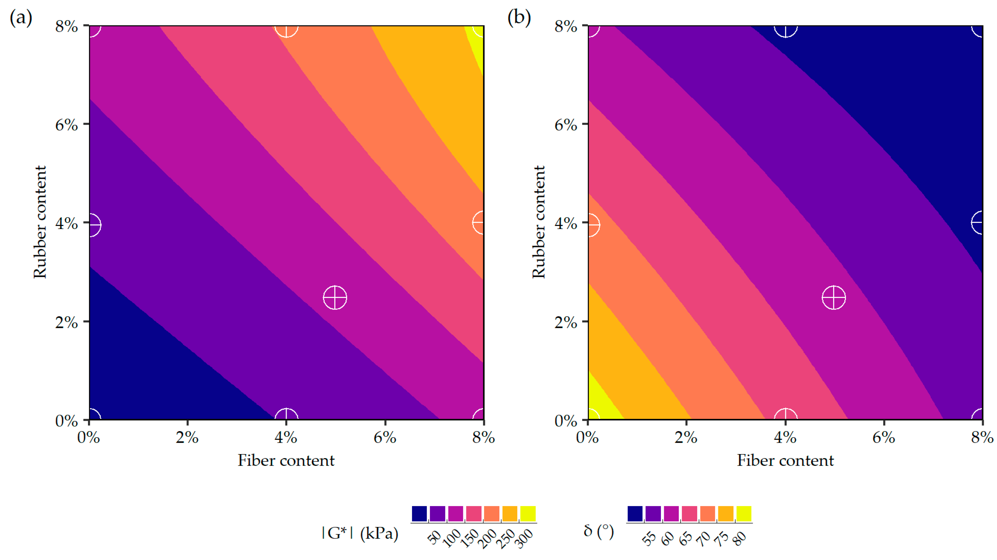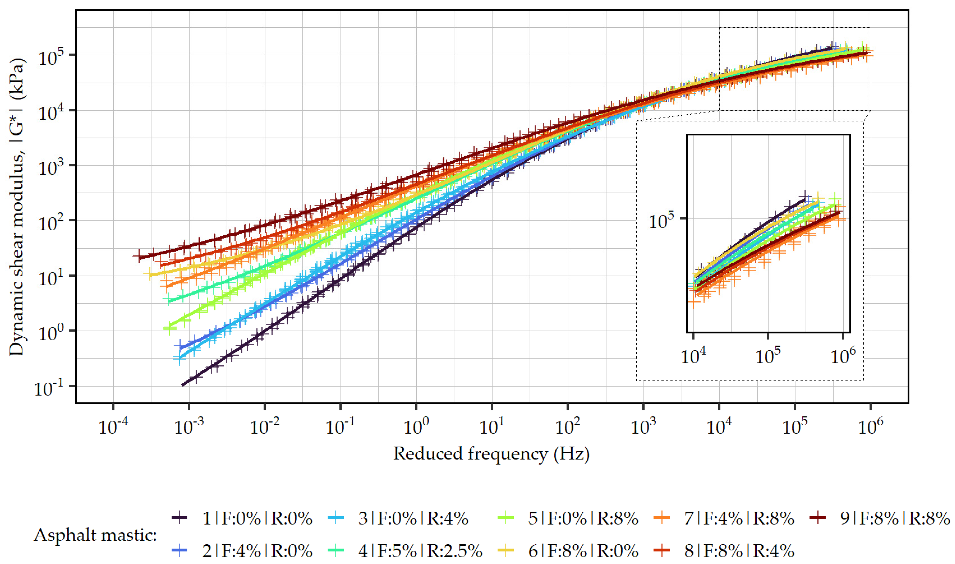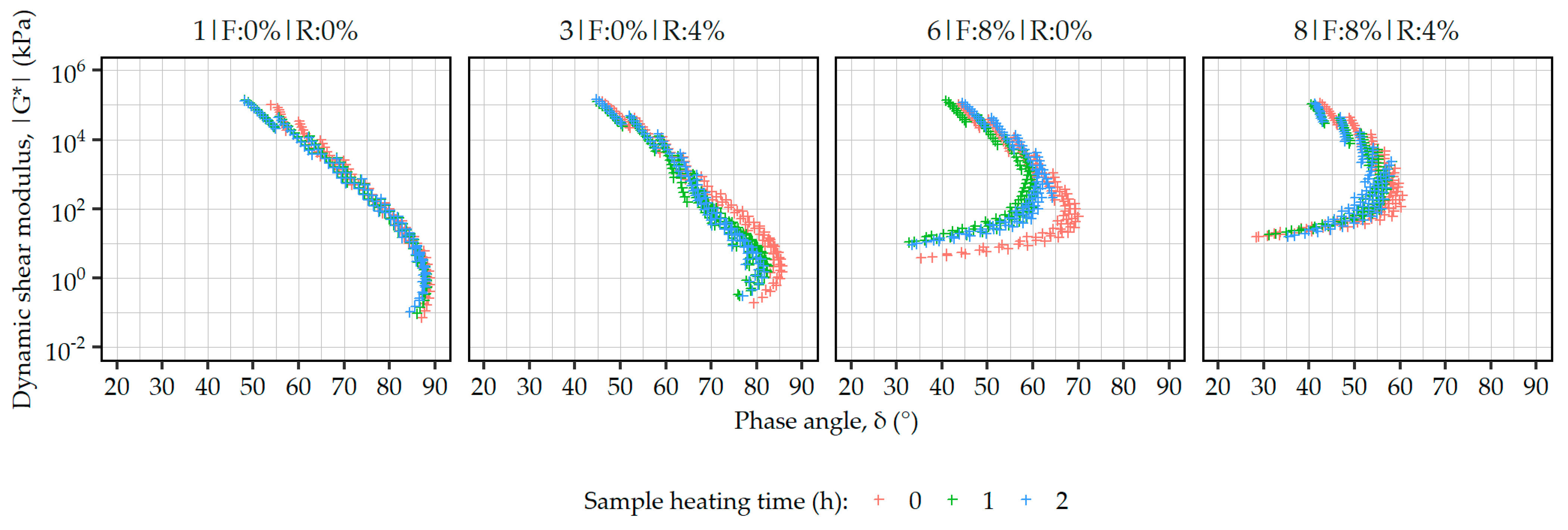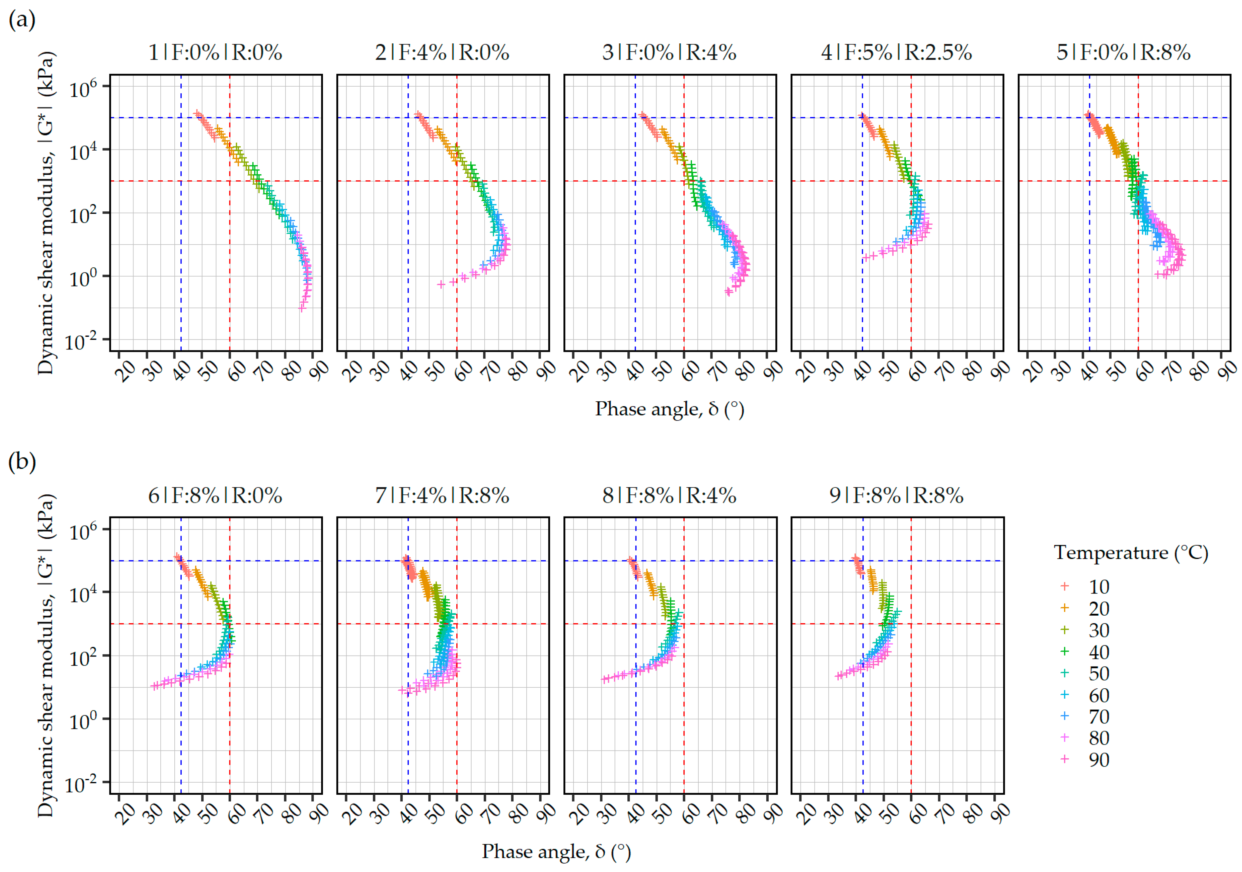 - Dynamic shear modulus (|G*|) and phase angle (δ) determined in accordance with EN 14770 [45], at temperatures from 10 to 90 °C in steps of 10 °C, at frequencies from 0.16 to 16 Hz under controlled strain;