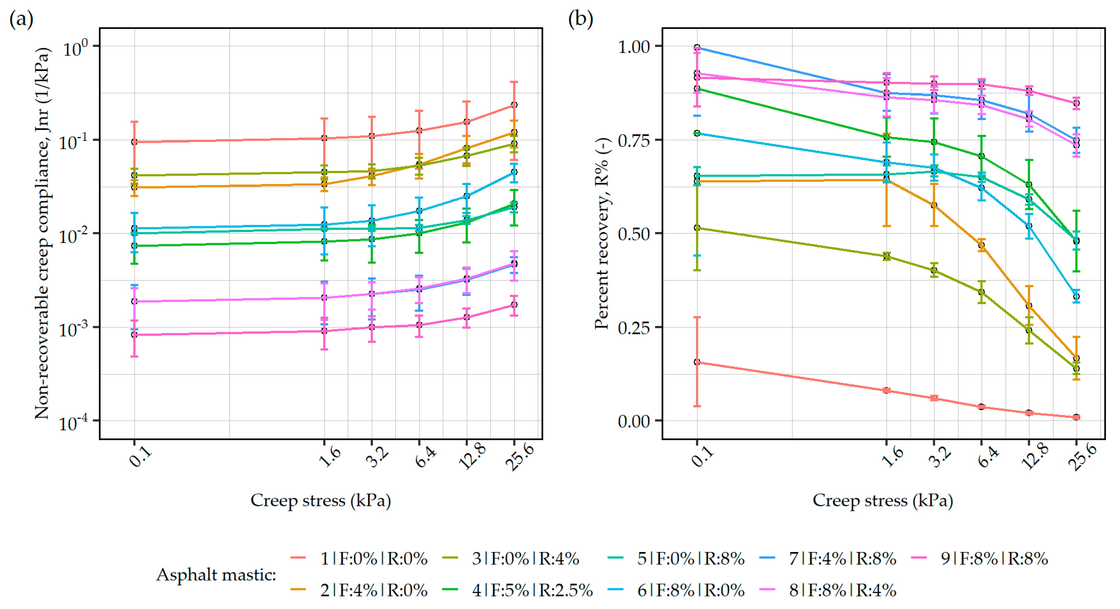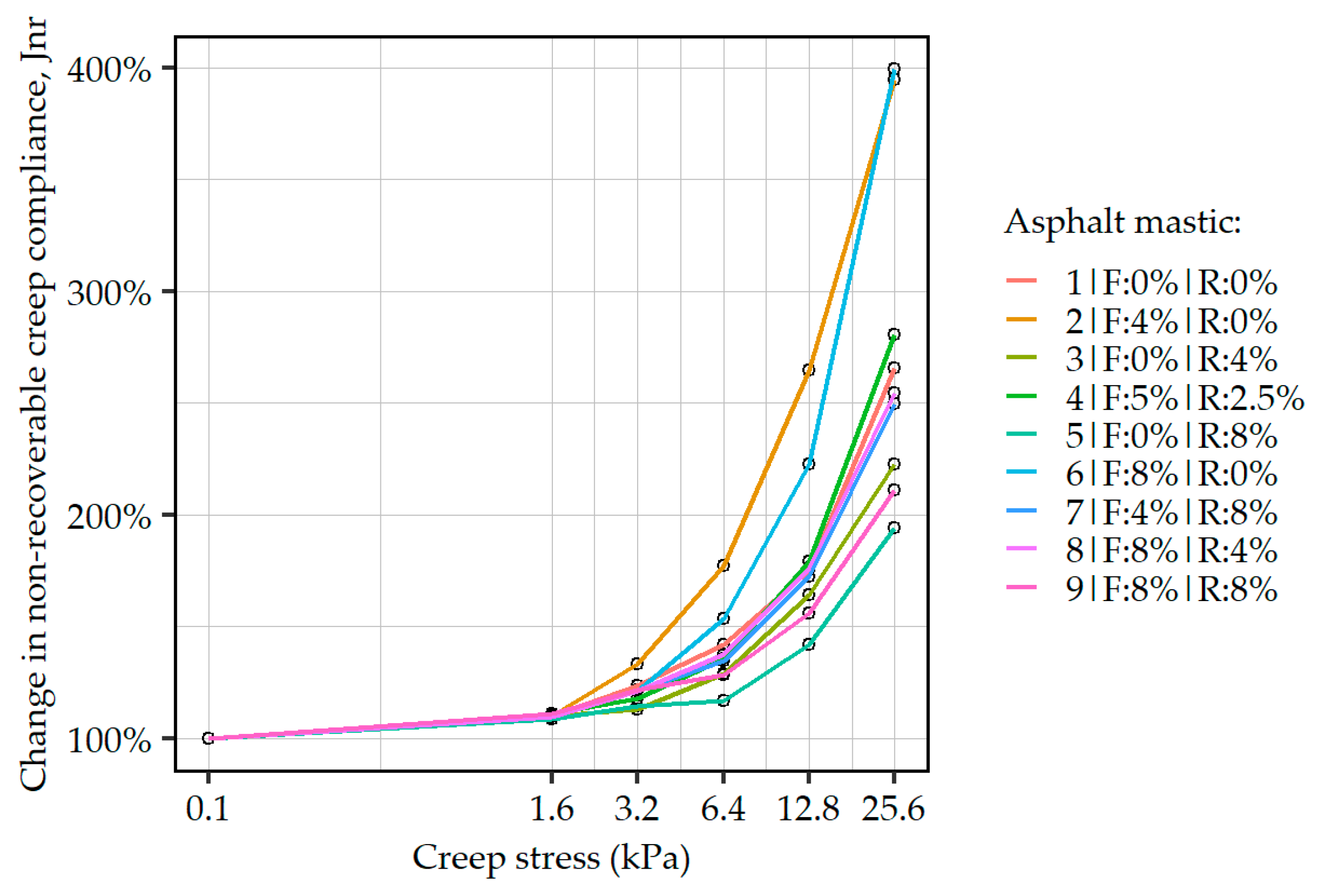 - Multiple stress creep recovery tests carried out in accordance with the EN 16659 [46] at a temperature of 60 °C, in sequences of increasing shear stress values of 0.1, 1.6, 3.2, 6.4, 12.8, and 25.6 kPa.