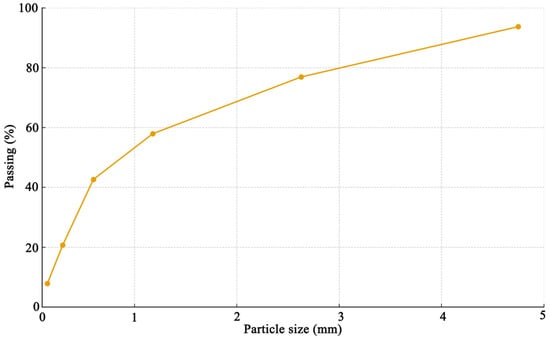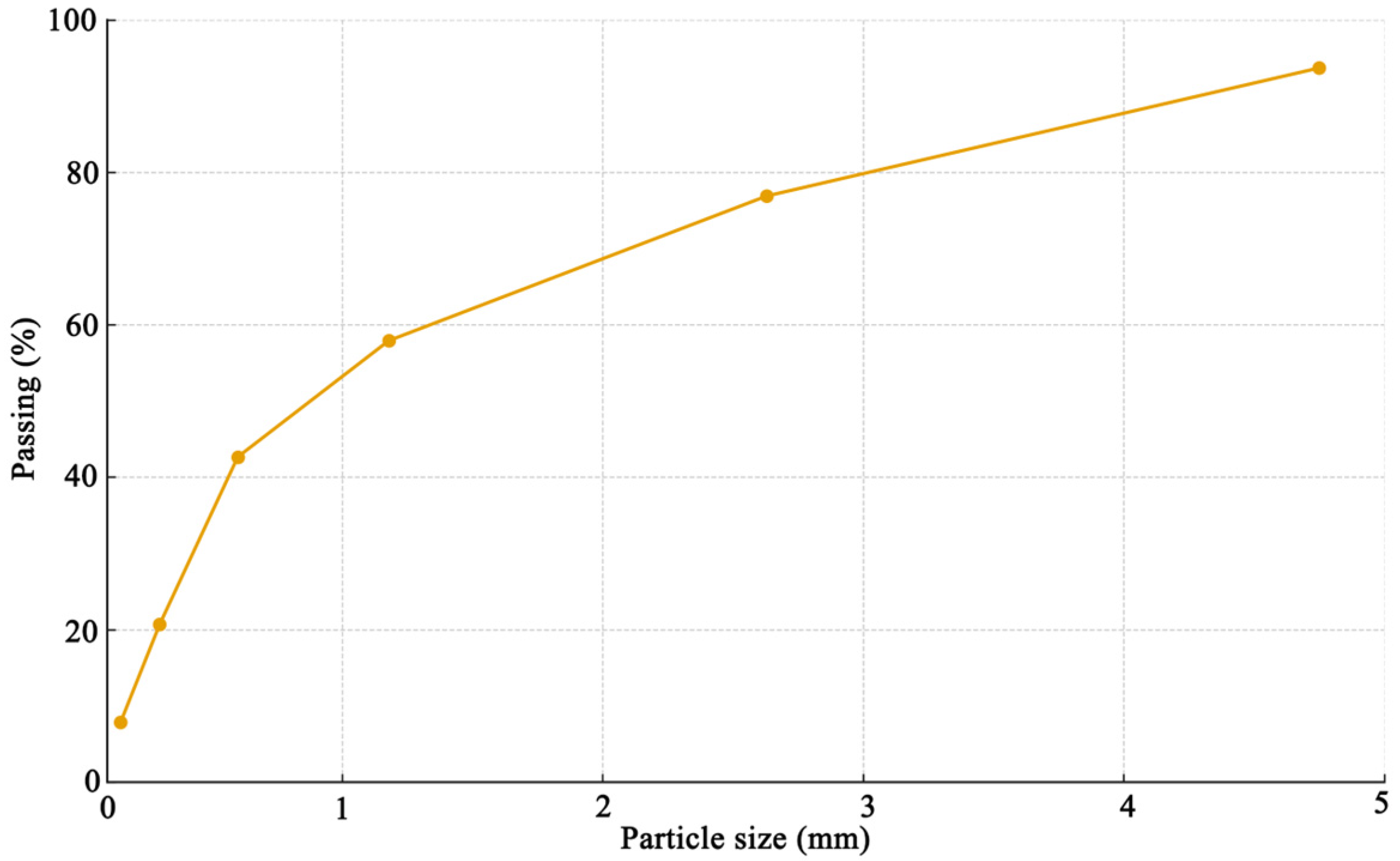 Natural river sand was used as the fine aggregate in this experiment (Figure 1). The sand was air-dried before mixing and characterized according to the particle size distribution obtained from sieve analysis. The results showed a well-graded composition, with the majority of particles distributed between 0.3 mm and 2.36 mm. The cumulative sieve residue reached approximately 93%, and the fineness modulus was calculated to be 2.8, classifying it as a medium sand according to GB/T 14684-2022 [29]. The sand exhibited good cleanliness and particle roundness, ensuring adequate workability and strength development of the concrete mixture.