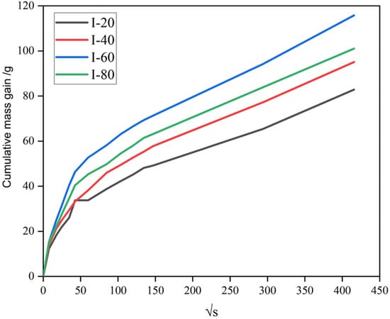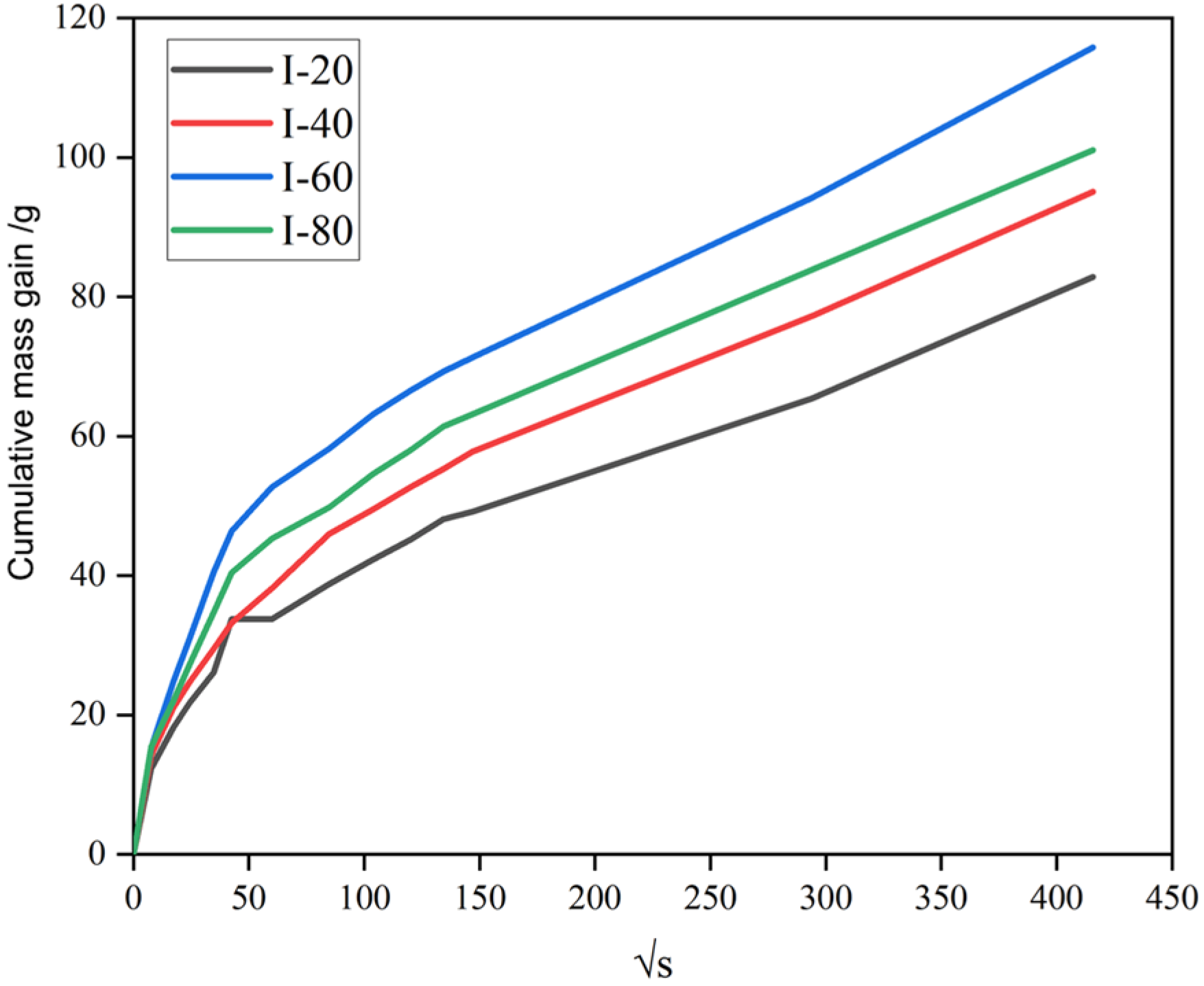 Figure 6. Cumulative water absorption plotted against the square root of time for C40 concrete specimens after impact loading, for different numbers of impact cycles (I-20, I-40, I-60, and I-80).