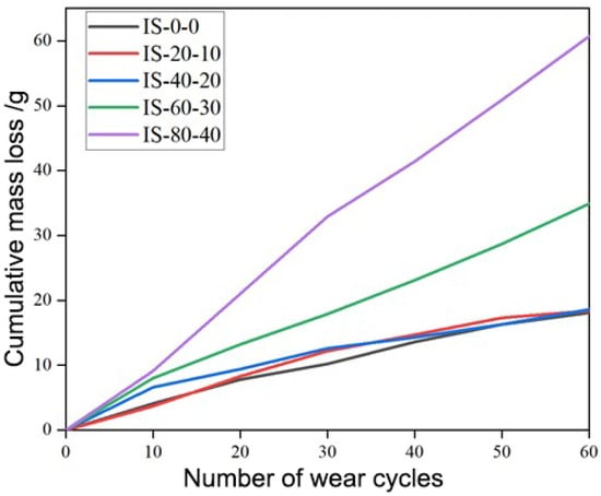 Figure 10. Cumulative mass loss of C40 concrete specimens under different combined impact–salt-fog cycles (IS-0-0, IS-20-10, IS-40-20, IS-60-30, and IS-80-40).